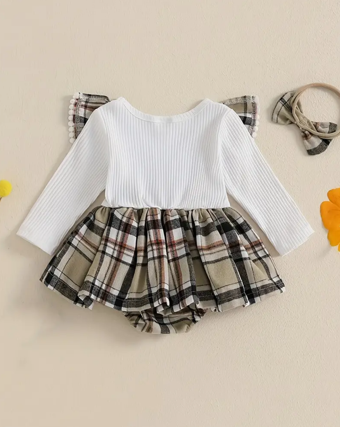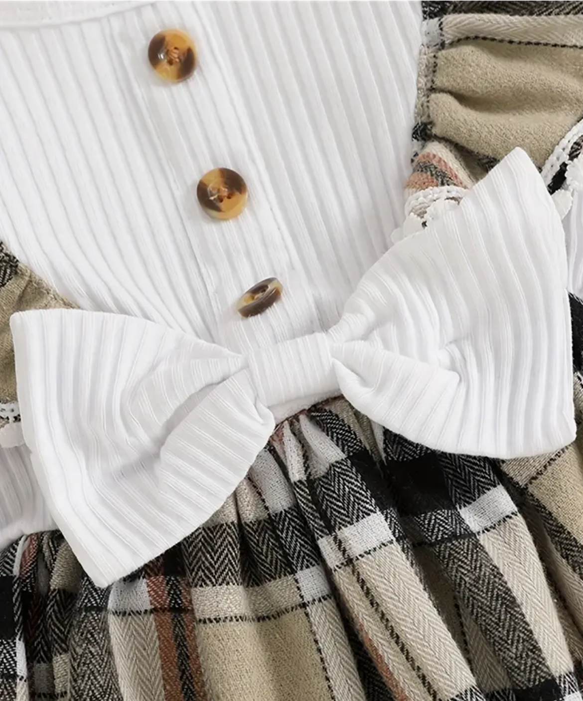 Confeccionado en algodón rib grueso con detalles de lazo, falda y mangas en pecho de baby corduroy es perfecto para paseos y celebraciones familiares con diseño de otoñal.