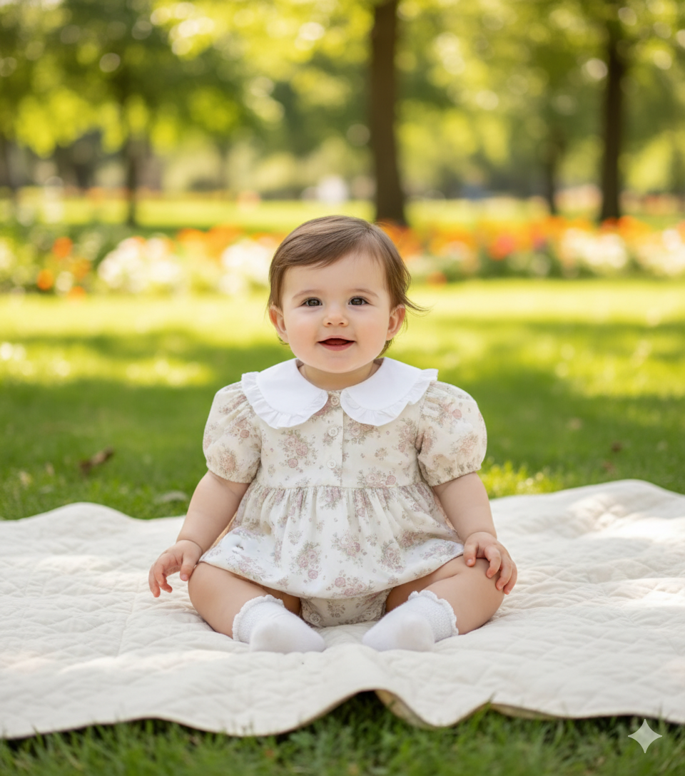 Este hermoso conjunto de una sola pieza con diseño floral vintage combina elegancia y practicidad para tu pequeña. Confeccionado en algodón suave y transpirable, cuenta con un cuello babero blanco con delicado vuelo y costuras detalladas que realzan su estilo atemporal.