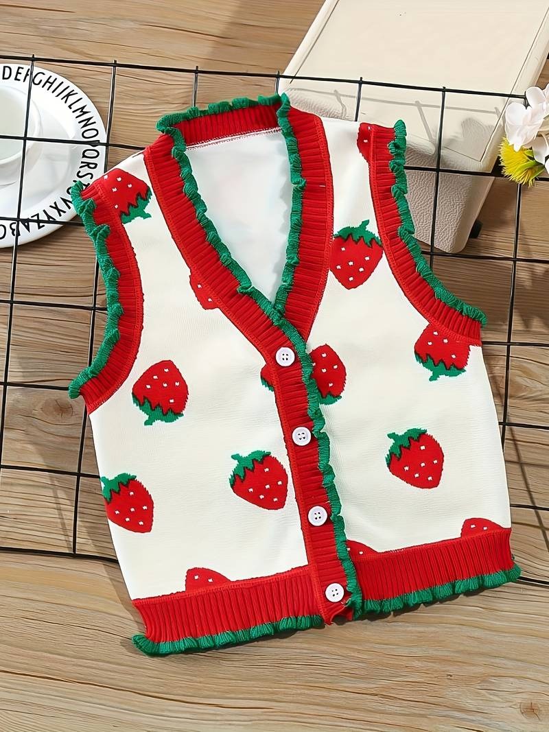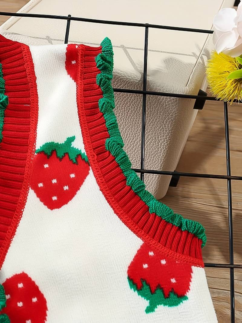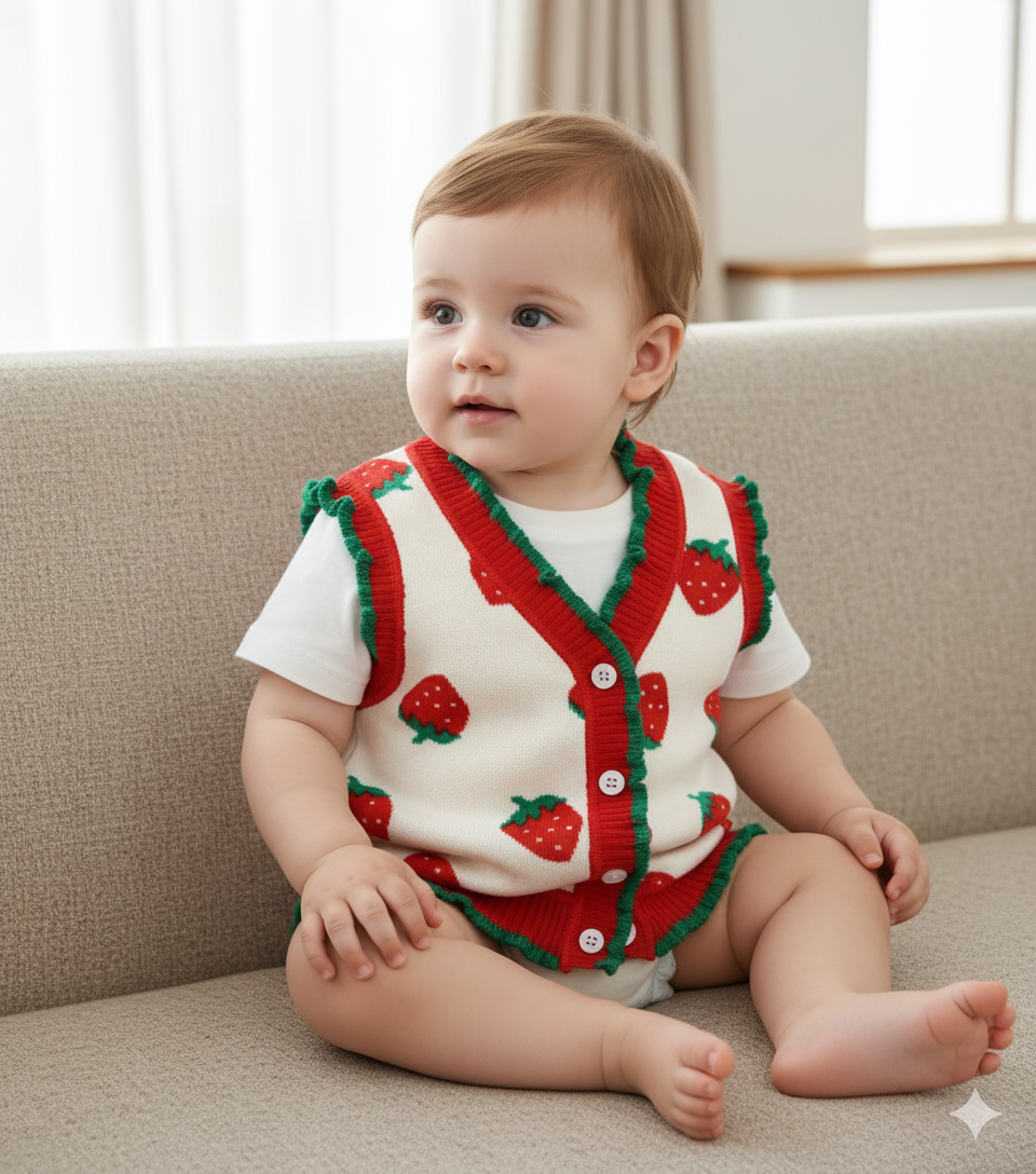 Diseño Lúdico de Fresas: El chaleco presenta un tejido de punto con un patrón distintivo de fresas rojas y hojas verdes, que le da un aspecto vibrante y divertido, perfecto para los más pequeños.