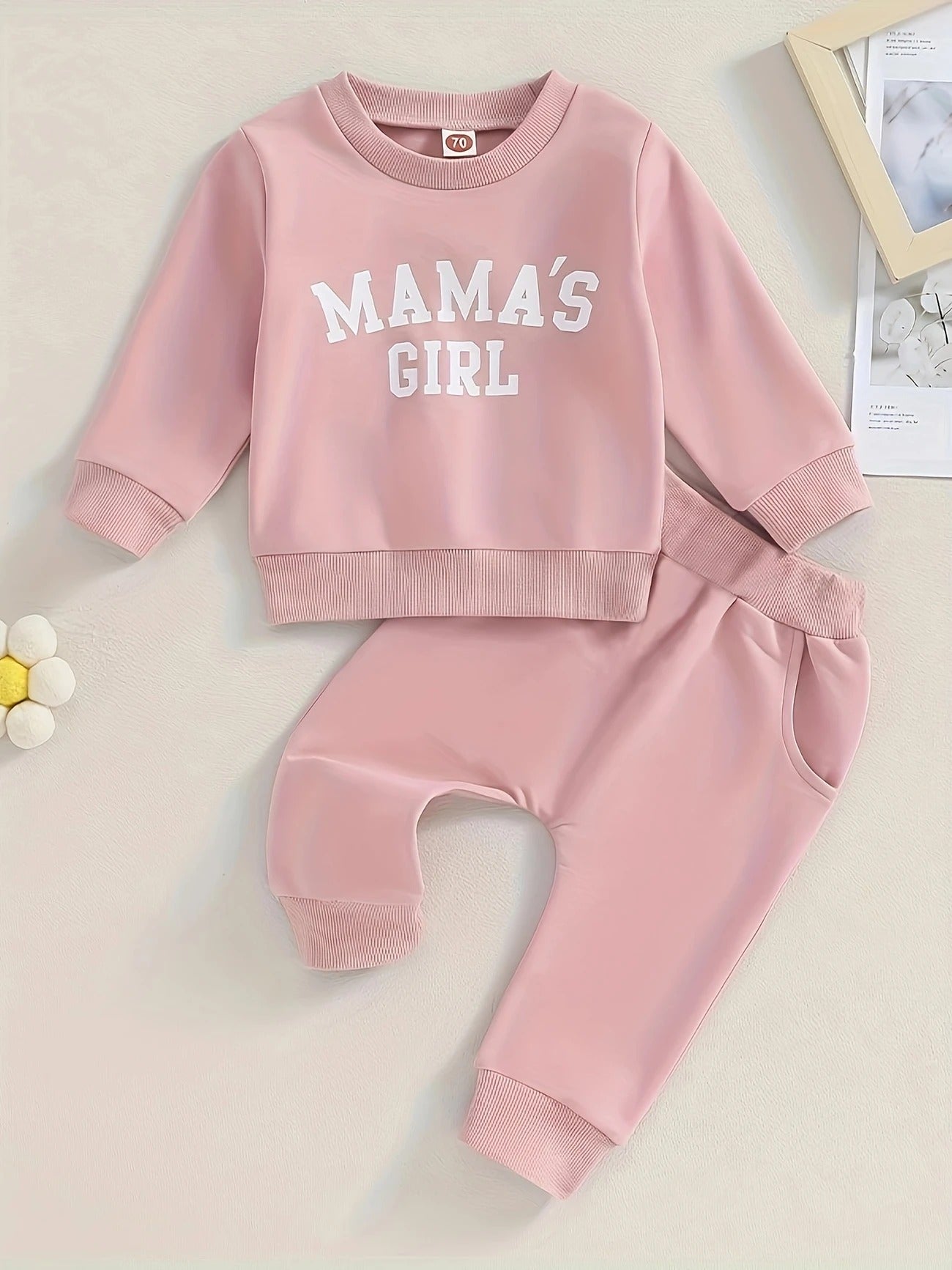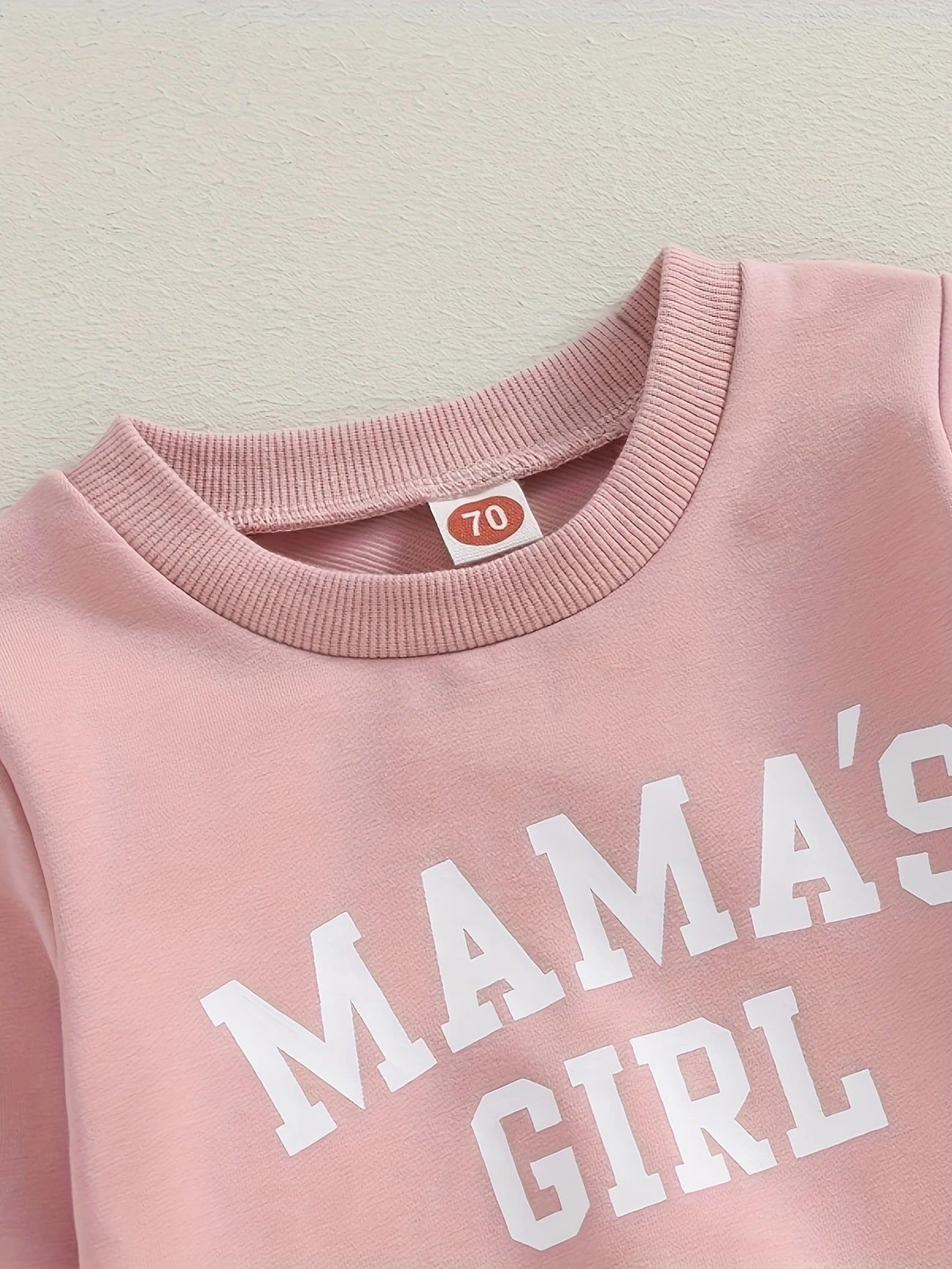 Estilo casual y moderno: Sudadera con el mensaje "MAMA'S GIRL" y pantalón deportivo, ideal para mamás y sus pequeñas.