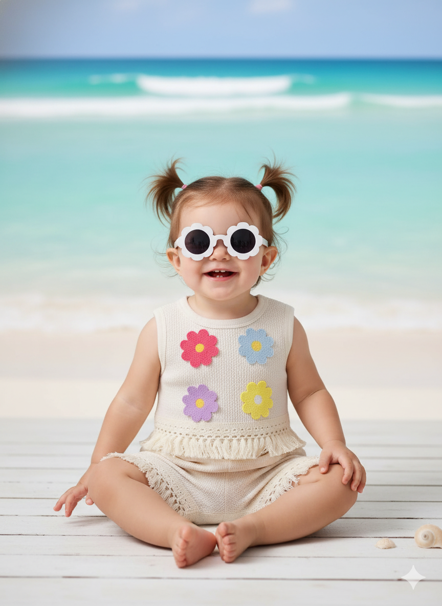 Prepara a tu pequeña para sus días de diversión bajo el sol con este encantador conjunto de dos piezas, diseñado para combinar un estilo irresistible y la máxima comodidad. Perfecto para sus aventuras veraniegas, este atuendo hará que tu bebé luzca adorable y se sienta fresca y lista para jugar.