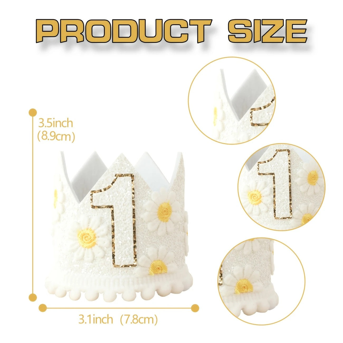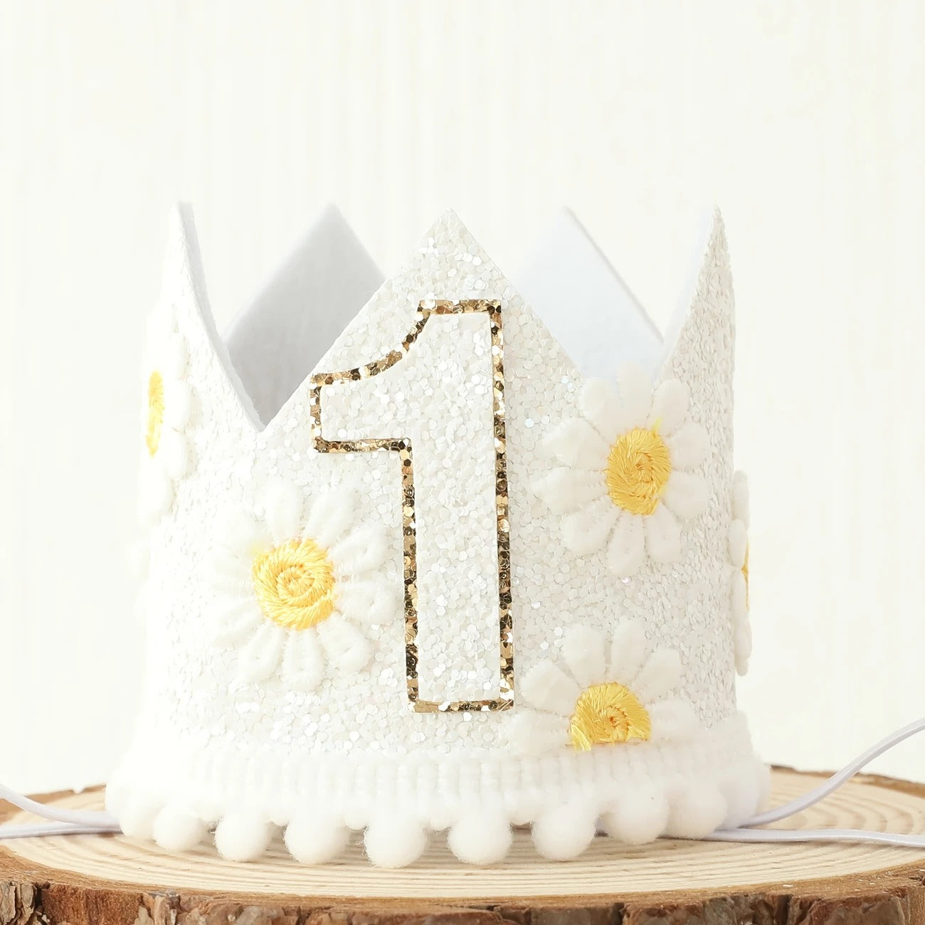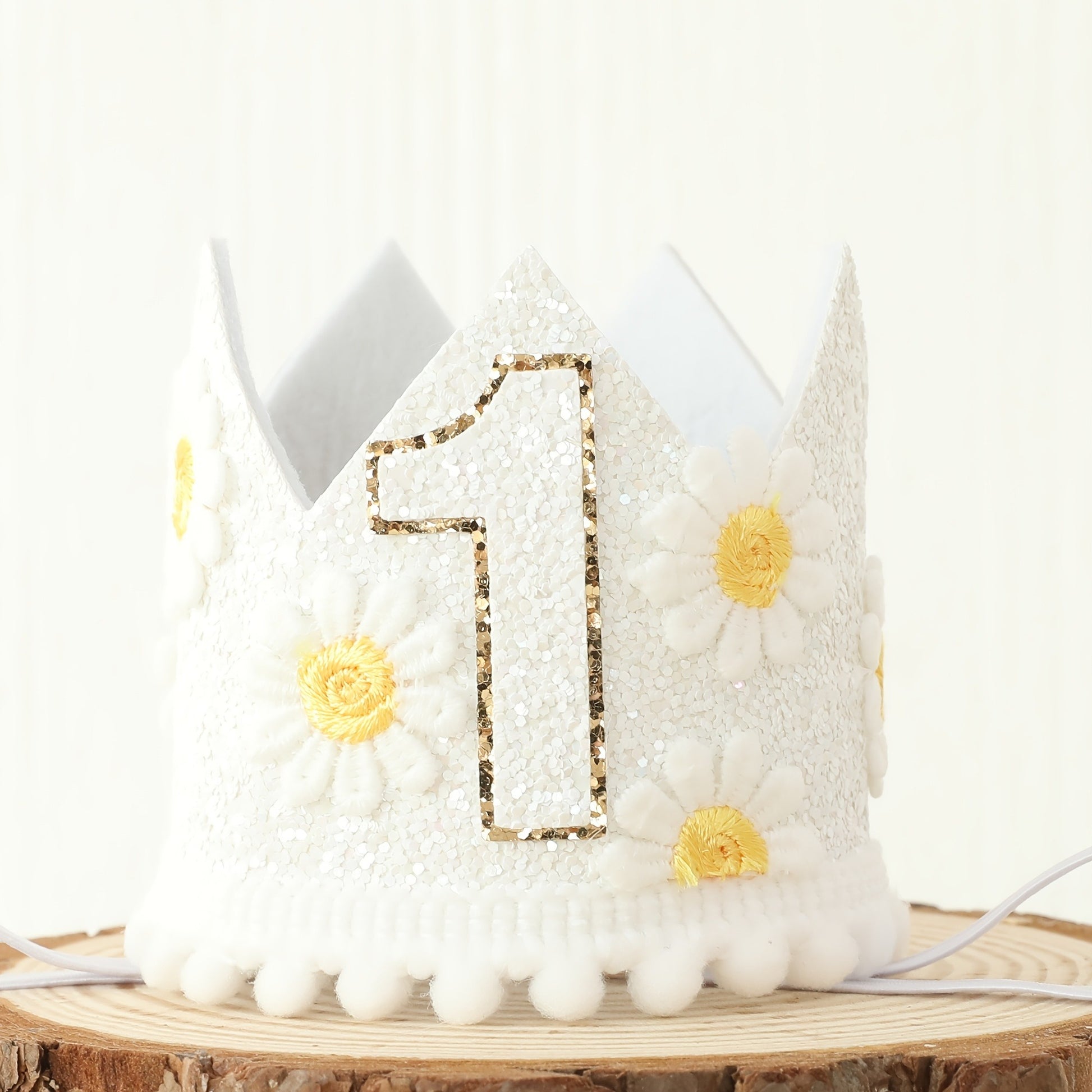 Diseño encantador: Adornada con flores de margarita y purpurina brillante, perfecta para ocasiones especiales.