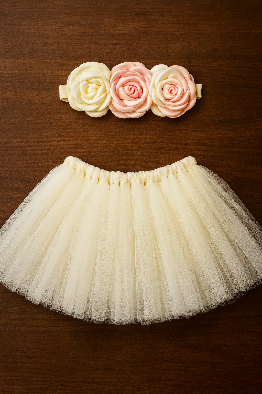 Haz de los primeros recuerdos de tu bebé algo inolvidable con este encantador set de tutu y diadema, especialmente diseñado para recién nacidas. Confeccionado en tul suave de alta calidad y detalles florales delicadamente elaborados, este conjunto es perfecto para sesiones fotográficas, bautizos o regalos especiales.