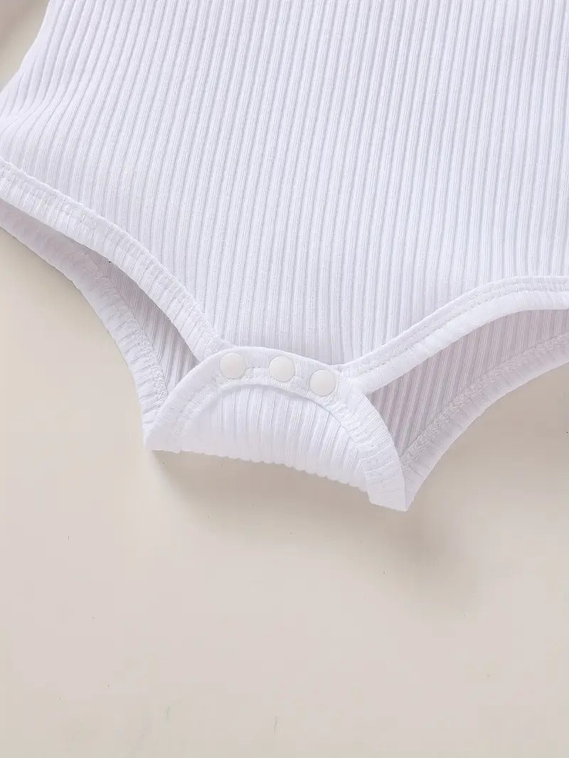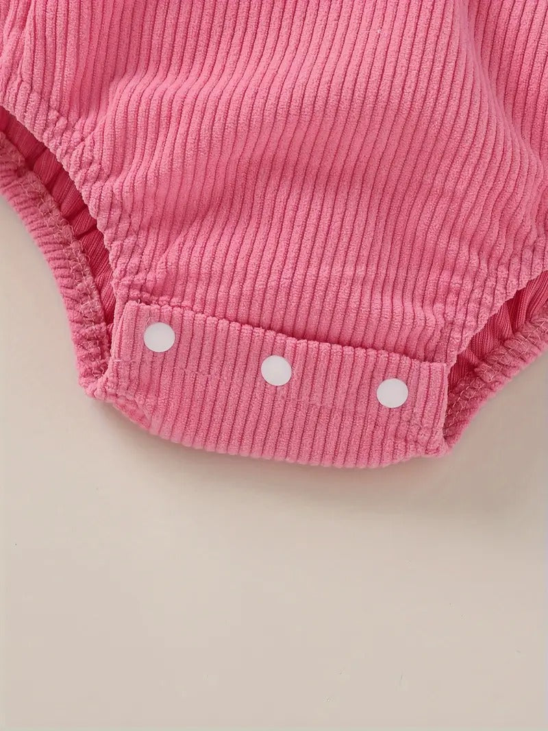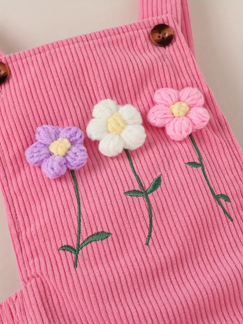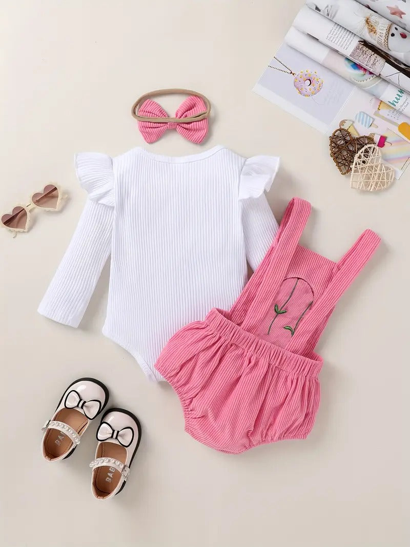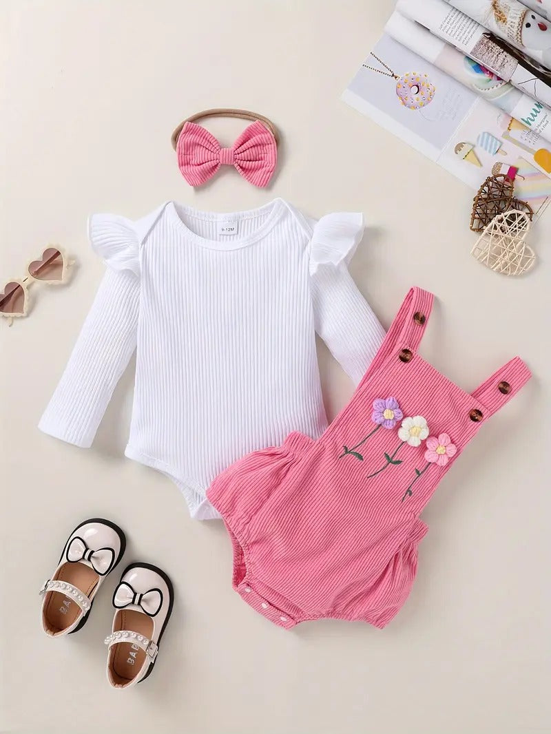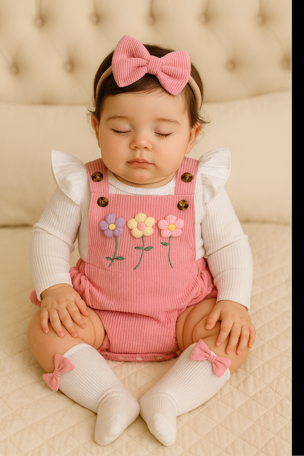 Este set de 3 piezas incluye un body blanco de manga larga con volantes en los hombros, un enterizo tipo overol de pana rosado con tirantes, bordado con flores multicolores, y diadema delicado de lazo rosa. ¡Perfecto para sesiones de fotos, paseos o cualquier ocasión especial!