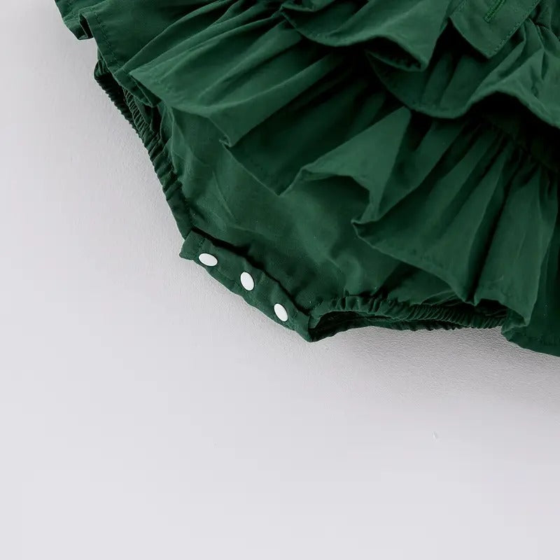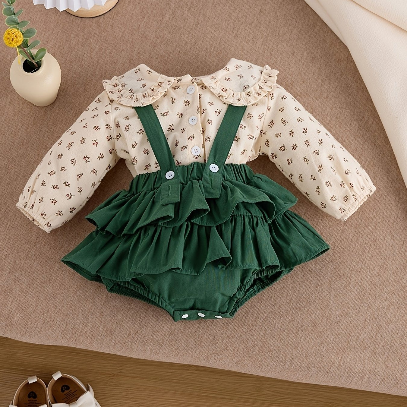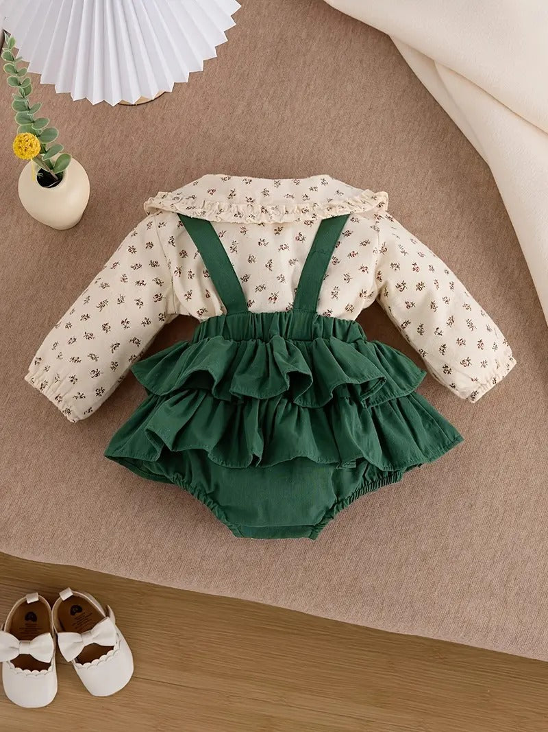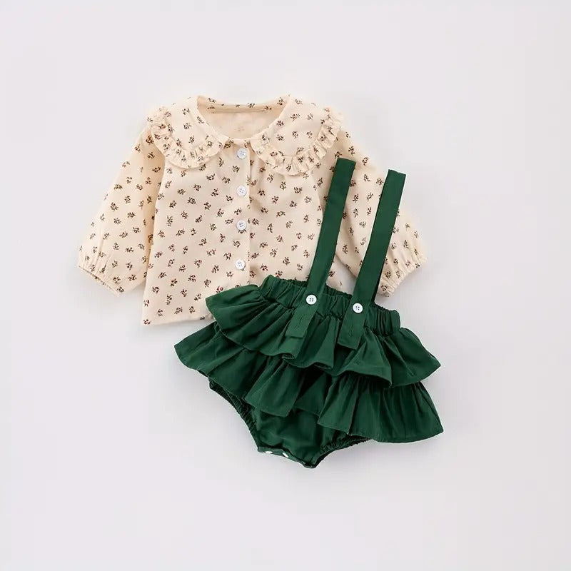 Este encantador conjunto de dos piezas combina una delicada blusita beige con estampado floral y cuello Peter Pan, con un bombachudo verde esmeralda de volantes y tirantes que roban todas las miradas.