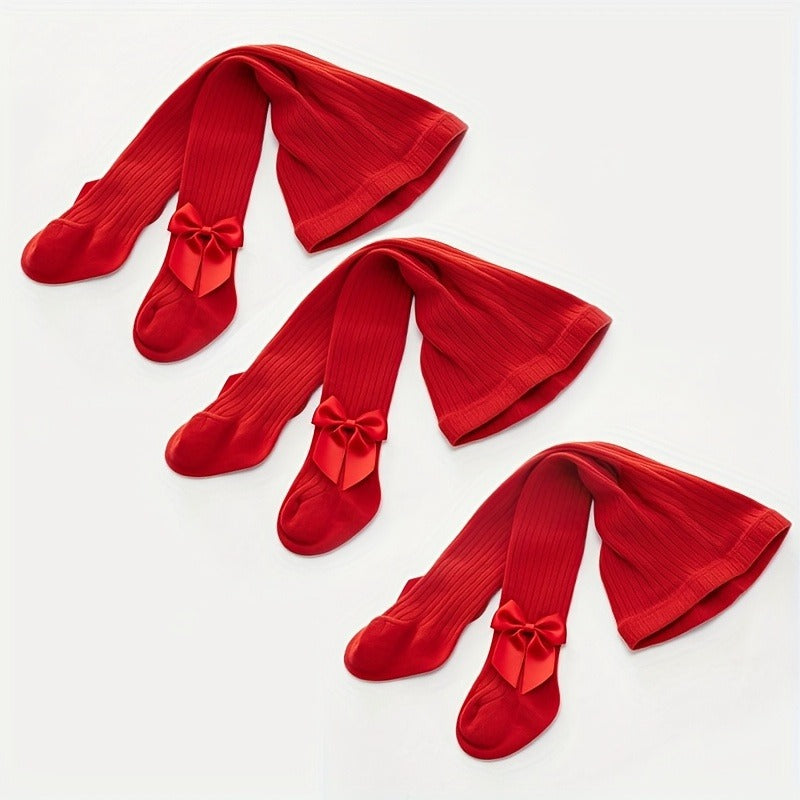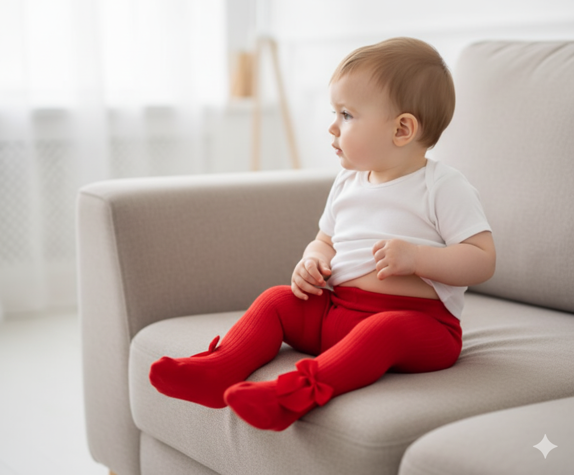 Pantys para bebé de color rojo vibrante, ideales para la temporada festiva (Navidad/Invierno) y disfraces. Tienen una textura acanalada suave y un hermoso lazo de satén en el tobillo para un toque coquette y elegante. Son el accesorio perfecto para mantener a tu niña abrigada con estilo.