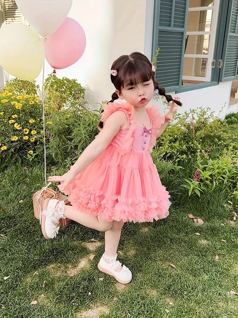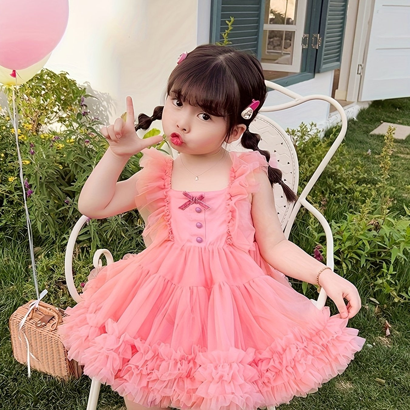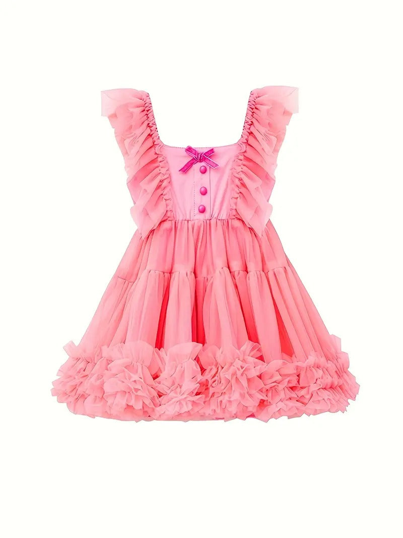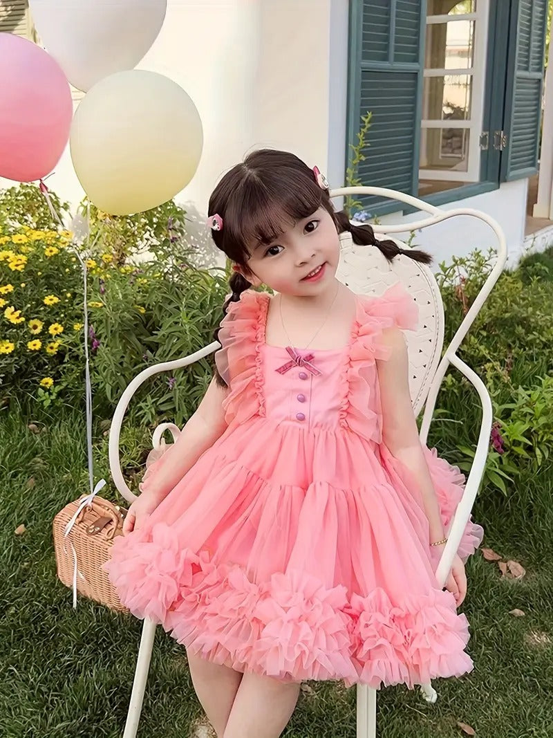 Haz que cada momento se convierta en un recuerdo mágico con este hermoso vestido de tul rosa para niñas, diseñado especialmente para las pequeñas que aman brillar. Con un delicado diseño de volantes en las mangas y una falda con múltiples capas de tul suave adornadas con flores en relieve, este vestido es perfecto para ocasiones especiales como cumpleaños, sesiones de fotos o celebraciones familiares.