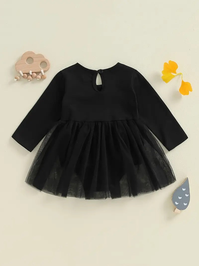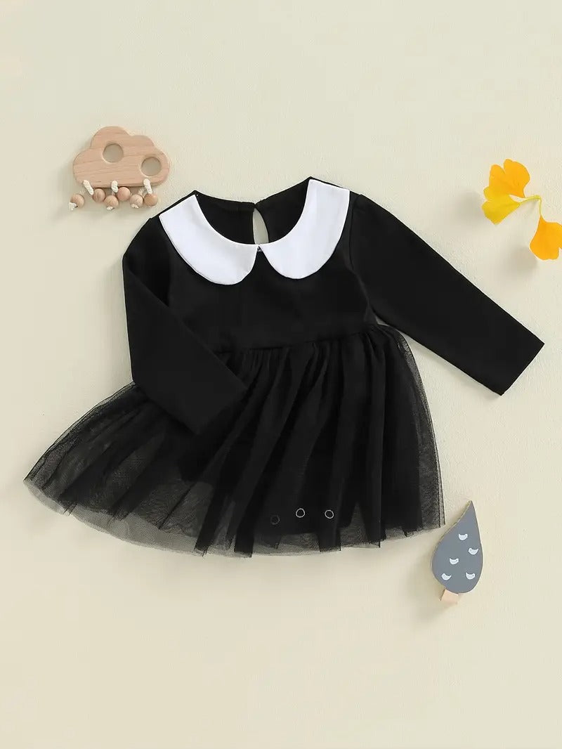 Este vestido es una pieza de ensueño que fusiona la inocencia con un toque de sofisticación gótica, creando un estilo único y elegante para tu bebé. El diseño se centra en un contraste clásico y atemporal que le da un aire de encanto y distinción.