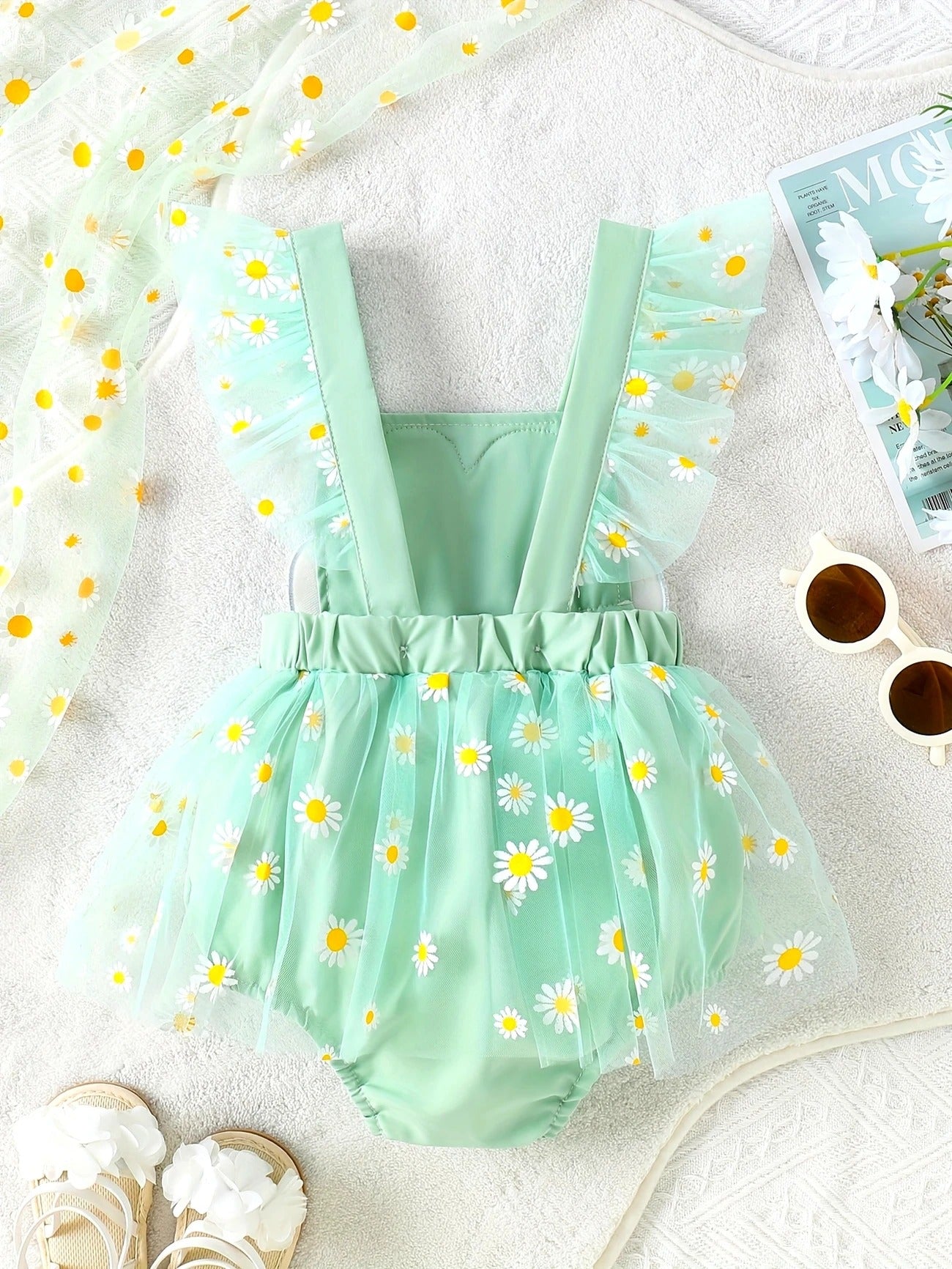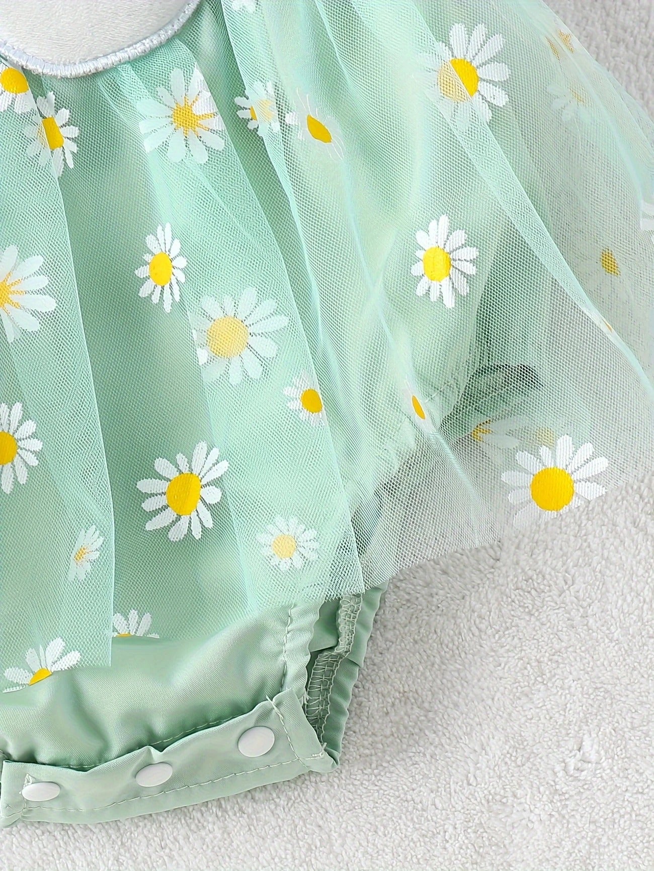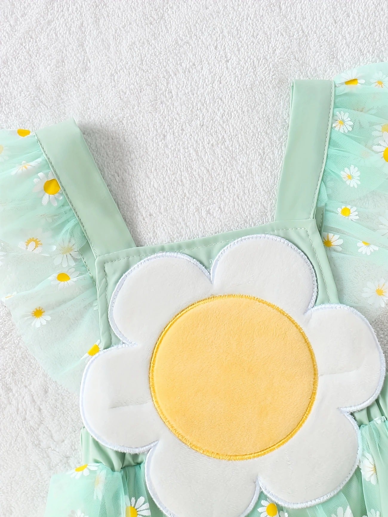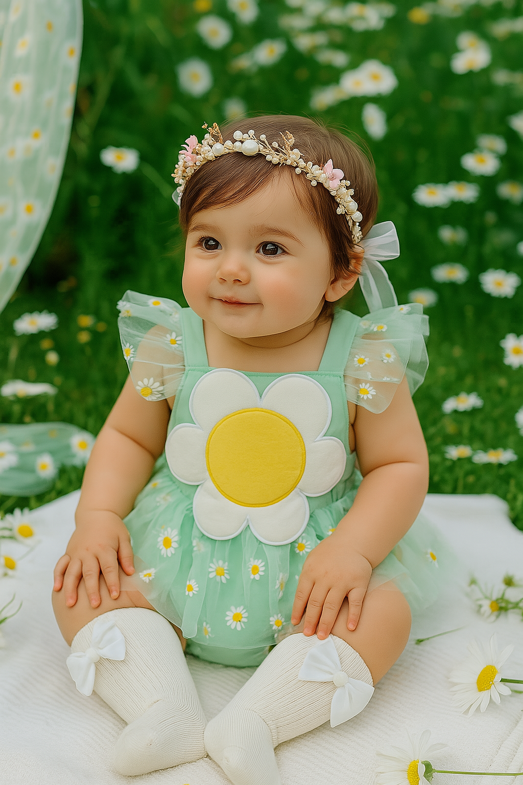 Haz que tu bebé brille como una flor en primavera con este enterizo inspirado en margaritas. Diseñado con un delicado tul verde pastel y detalles bordados de margaritas, este outfit incorpora un tierno aplique central de flor que roba todas las miradas. Ideal para sesiones de fotos, cumpleaños, paseos al aire libre o simplemente para llenarte de amor en casa.