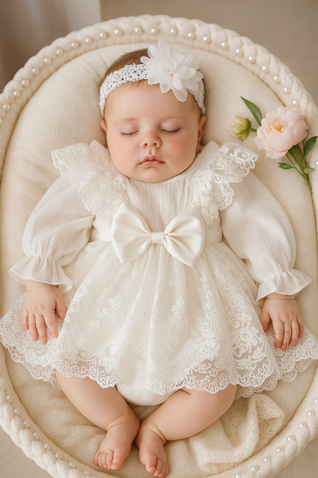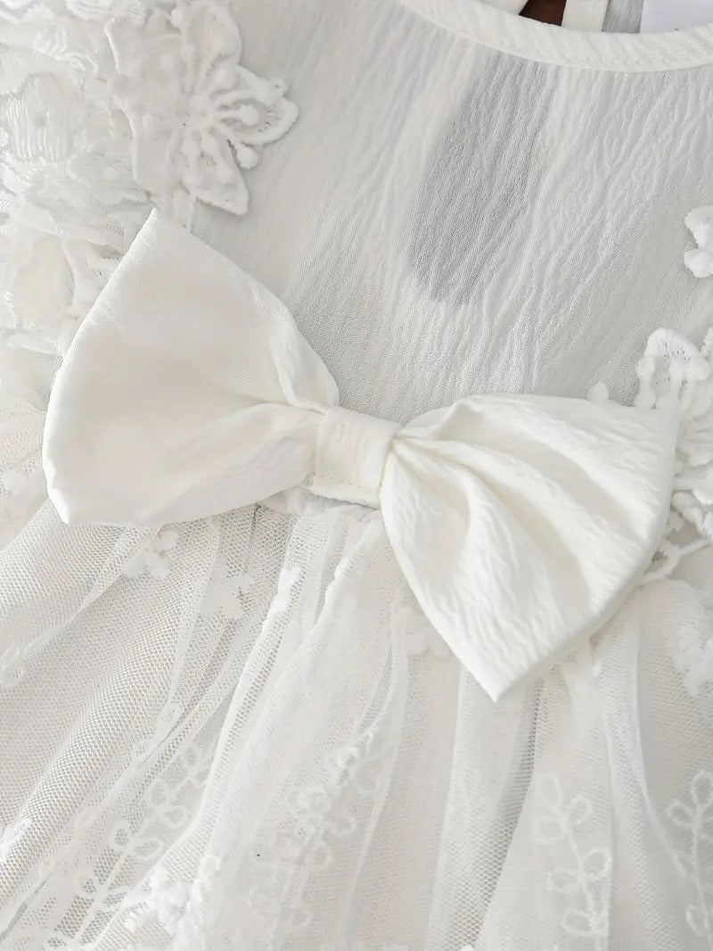 Haz que tu pequeña luzca como un ángel con este encantador vestido blanco de encaje, diseñado para ocasiones especiales que merecen un toque mágico.