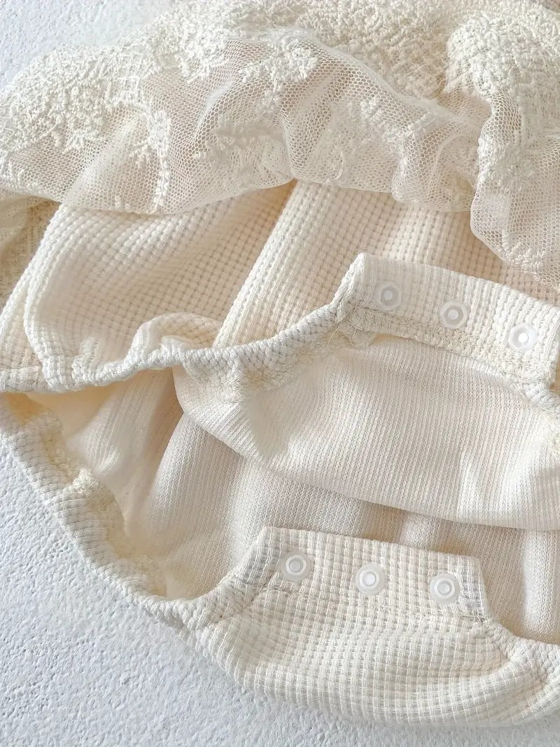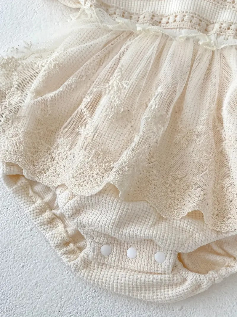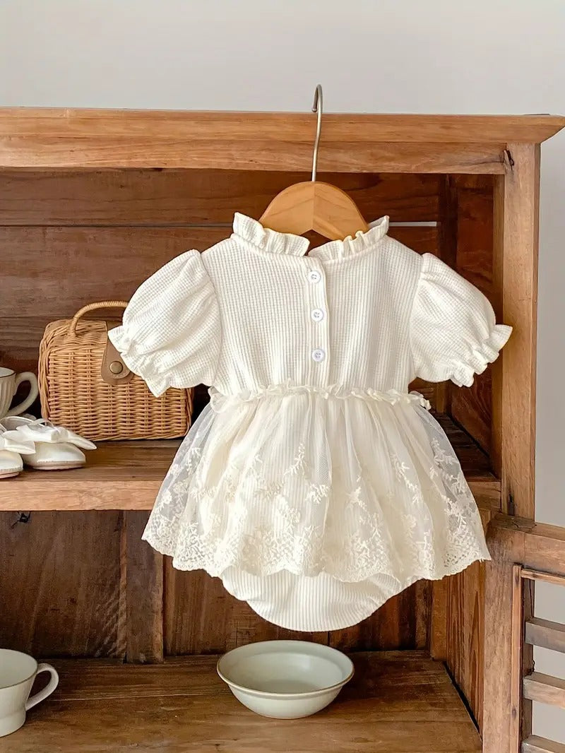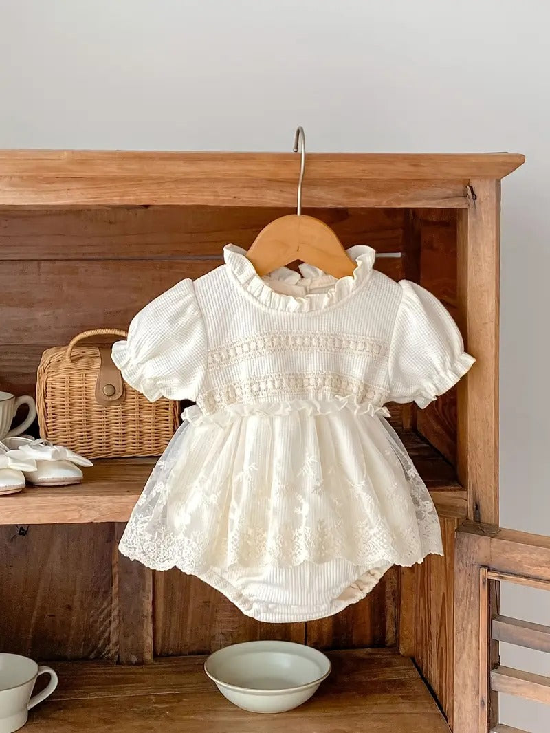 Dale a tu bebé un toque de elegancia atemporal con este encantador body vestido en tono marfil. Confeccionado en algodón suave acanalado y decorado con delicado encaje floral, este diseño combina la comodidad de un body con el estilo de un vestido clásico.
