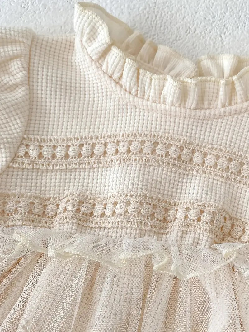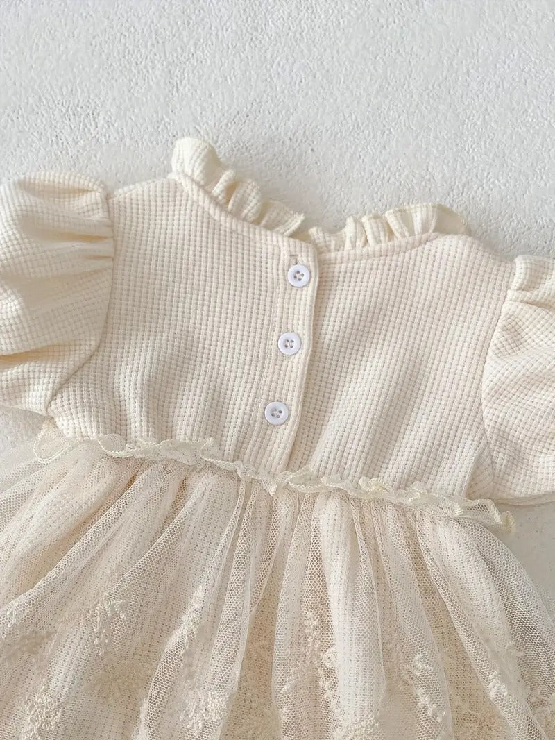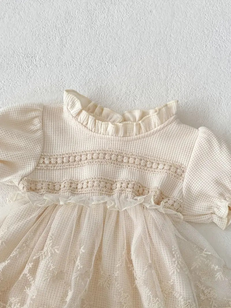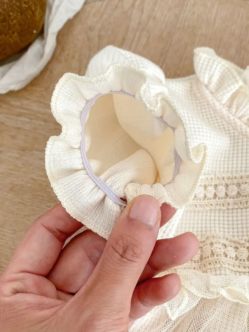 Dale a tu bebé un toque de elegancia atemporal con este encantador body vestido en tono marfil. Confeccionado en algodón suave acanalado y decorado con delicado encaje floral, este diseño combina la comodidad de un body con el estilo de un vestido clásico.
