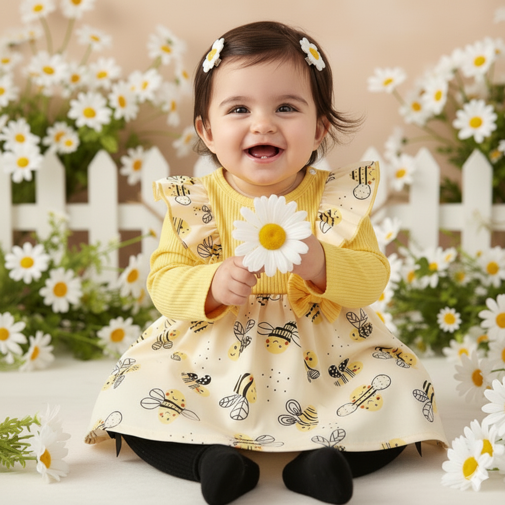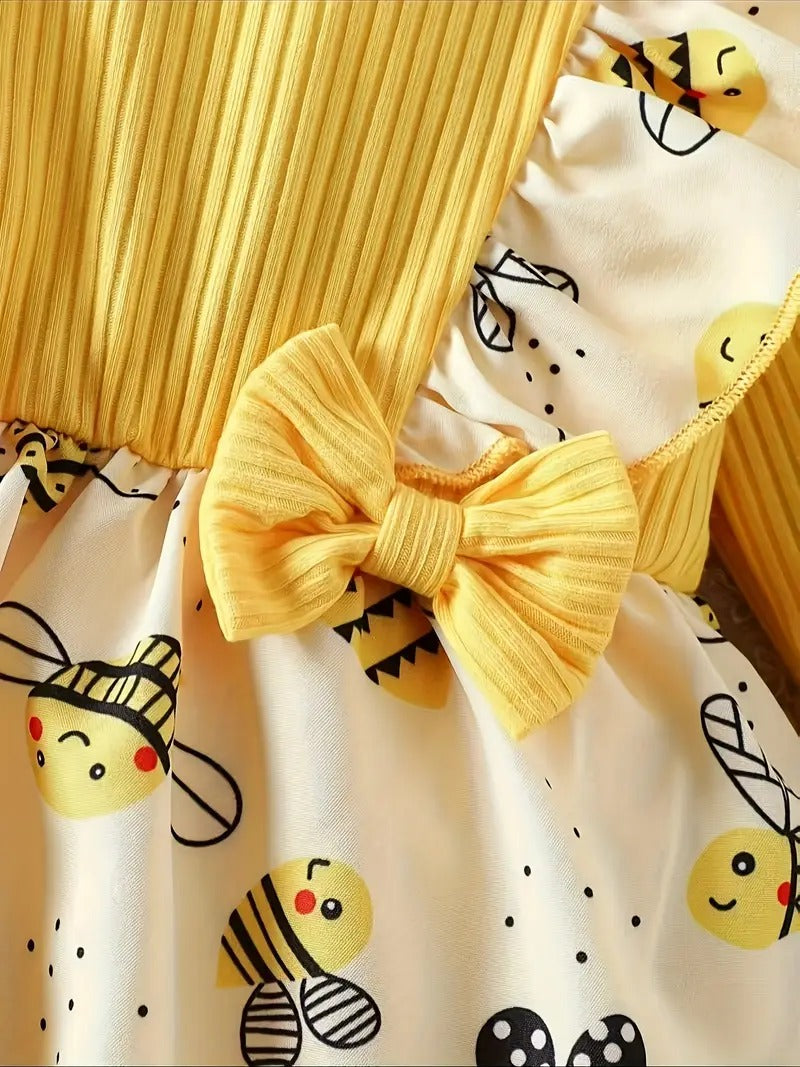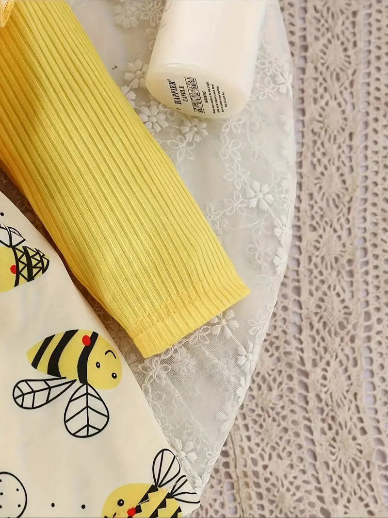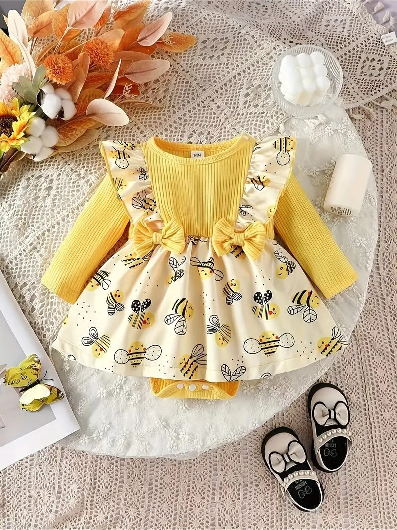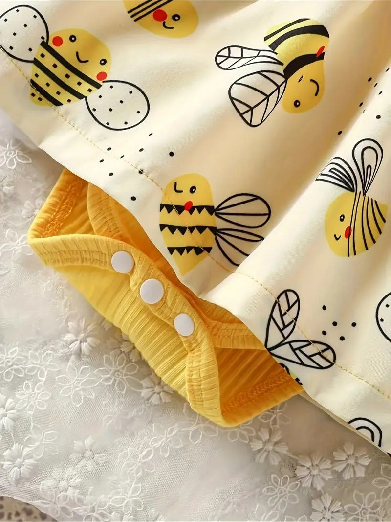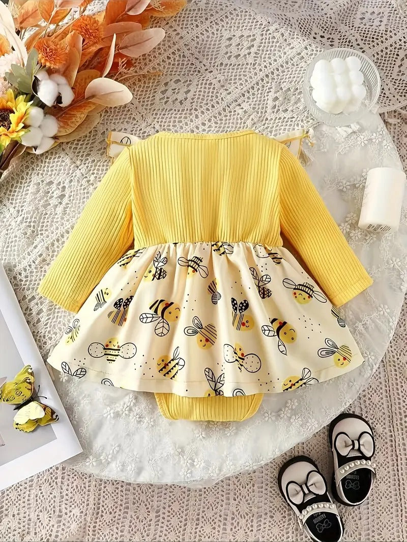 Falda (parte inferior del body): Estampado de abejas, lunares y corazones sobre un fondo crema/amarillo claro.