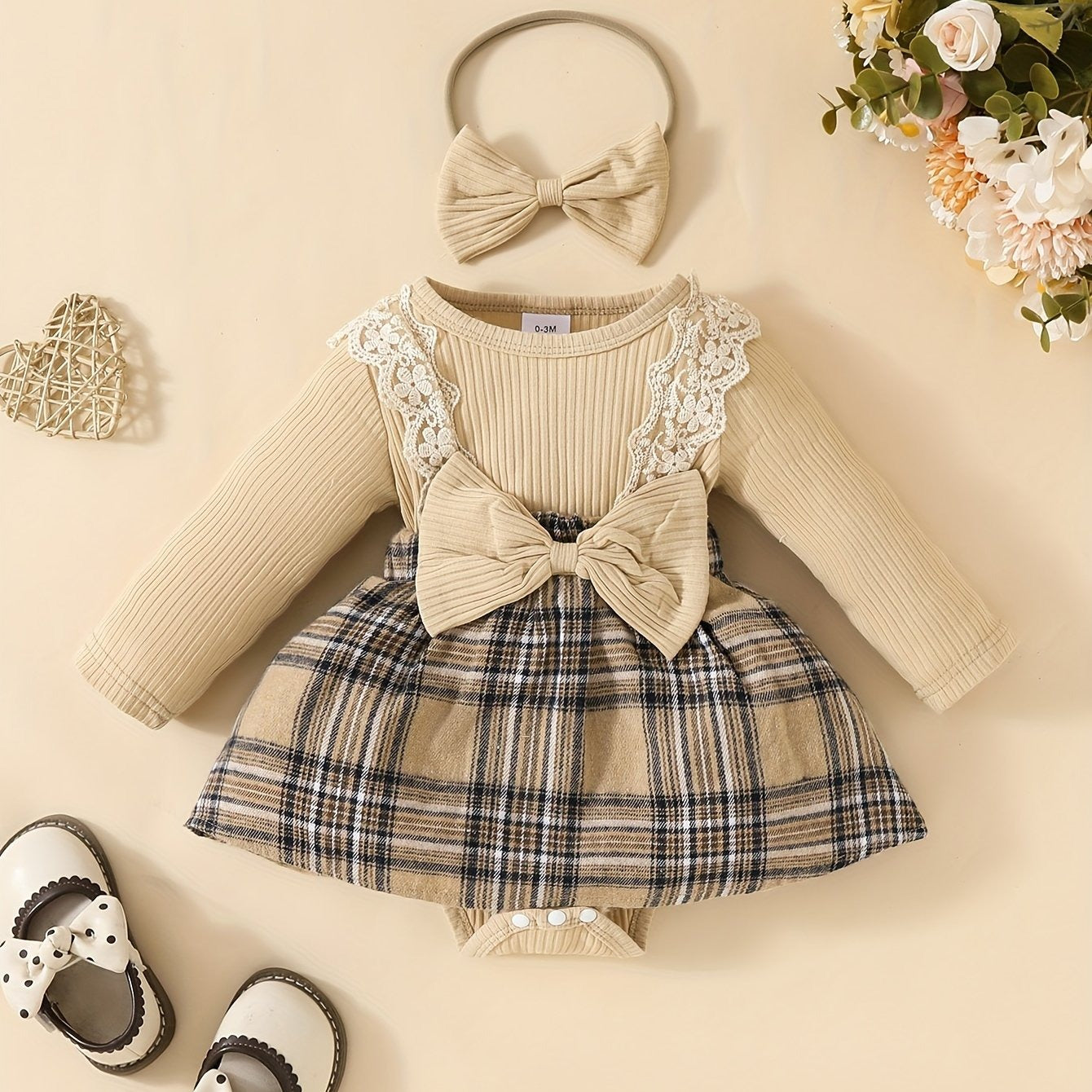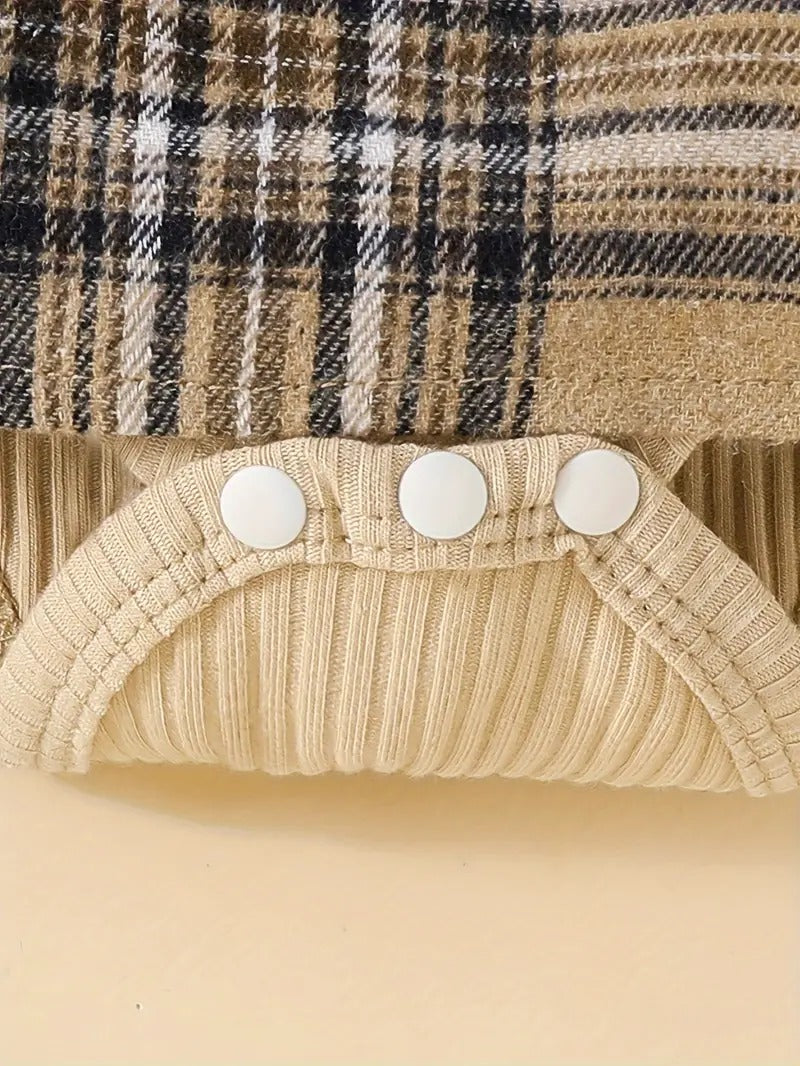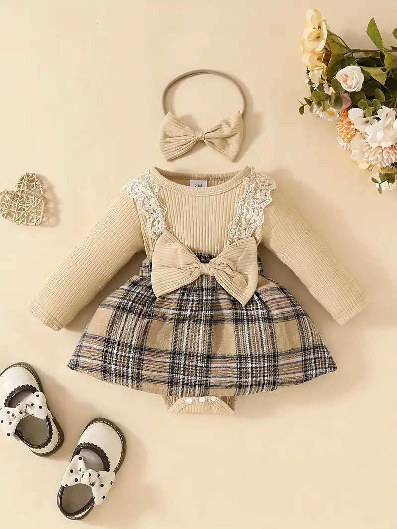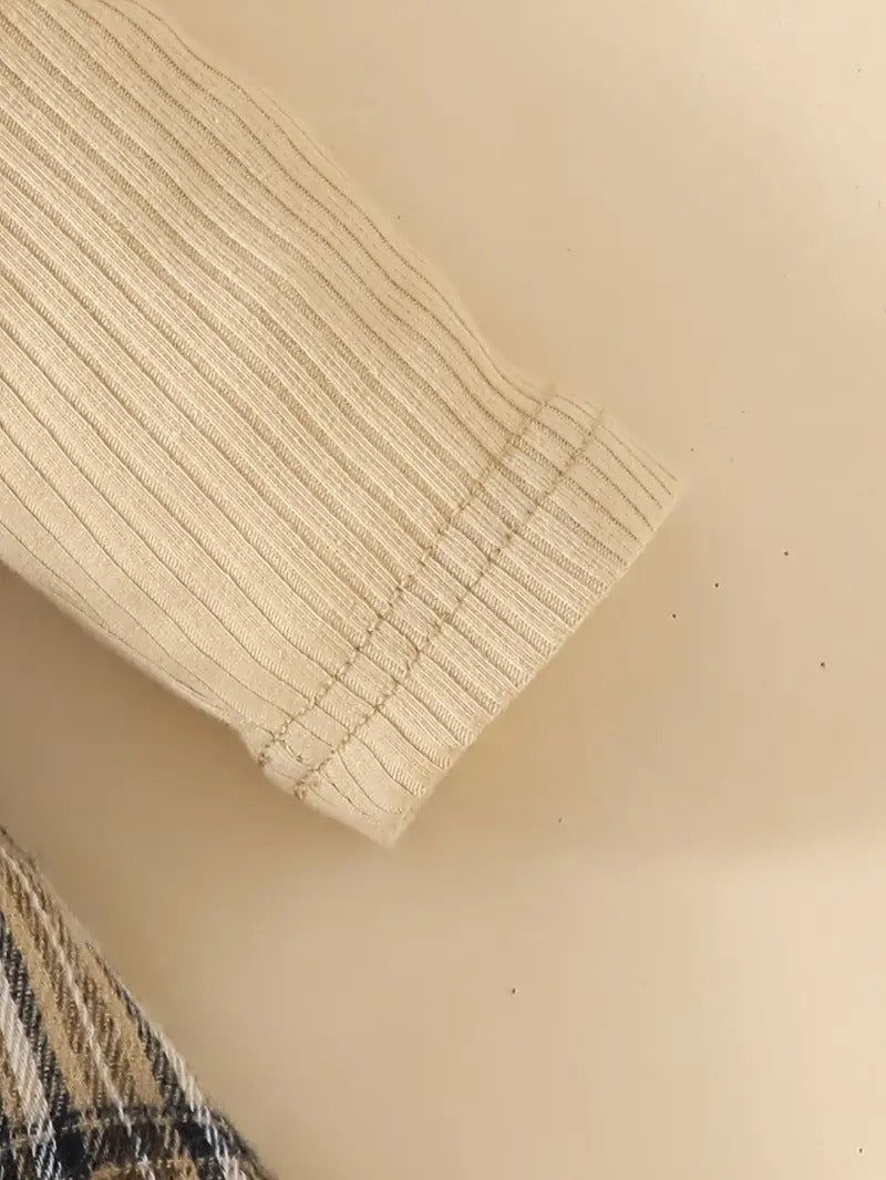 Vístela con un look preppy y acogedor: este set de tres piezas incluye un bodysuit canalé con cuello redondo y manga larga, una falda de cuadros con volante y un lazo delantero XL, más una diadema a juego. Con su mezcla de algodón y poliéster, elasticidad ligera y estampado escocés, es ideal para la temporada otoño‑invierno, la vuelta al cole o sesiones de fotos familiares.