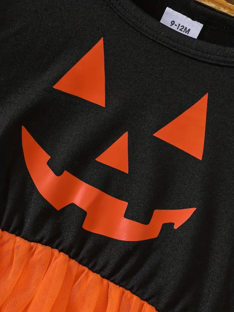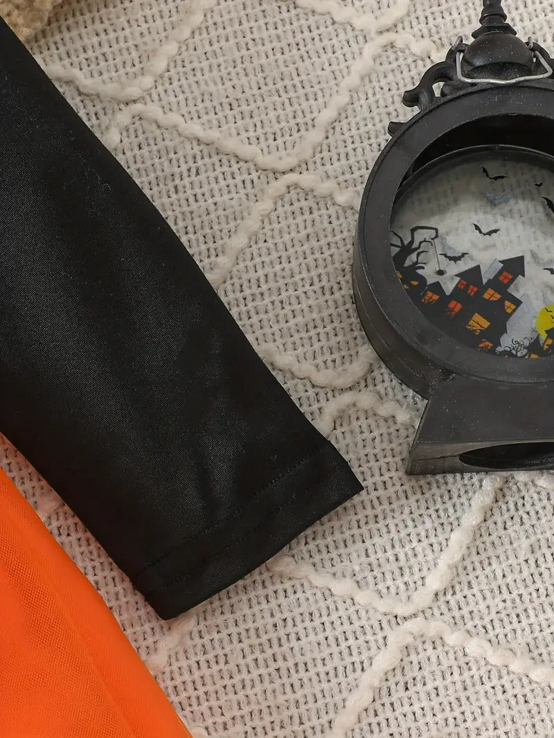 ¡Viste a tu pequeña para la noche de Halloween con este vestido adorable y festivo! Combina un top cómodo de manga larga con una falda de tul voluminosa para un look de calabaza que es tan dulce como un caramelo.