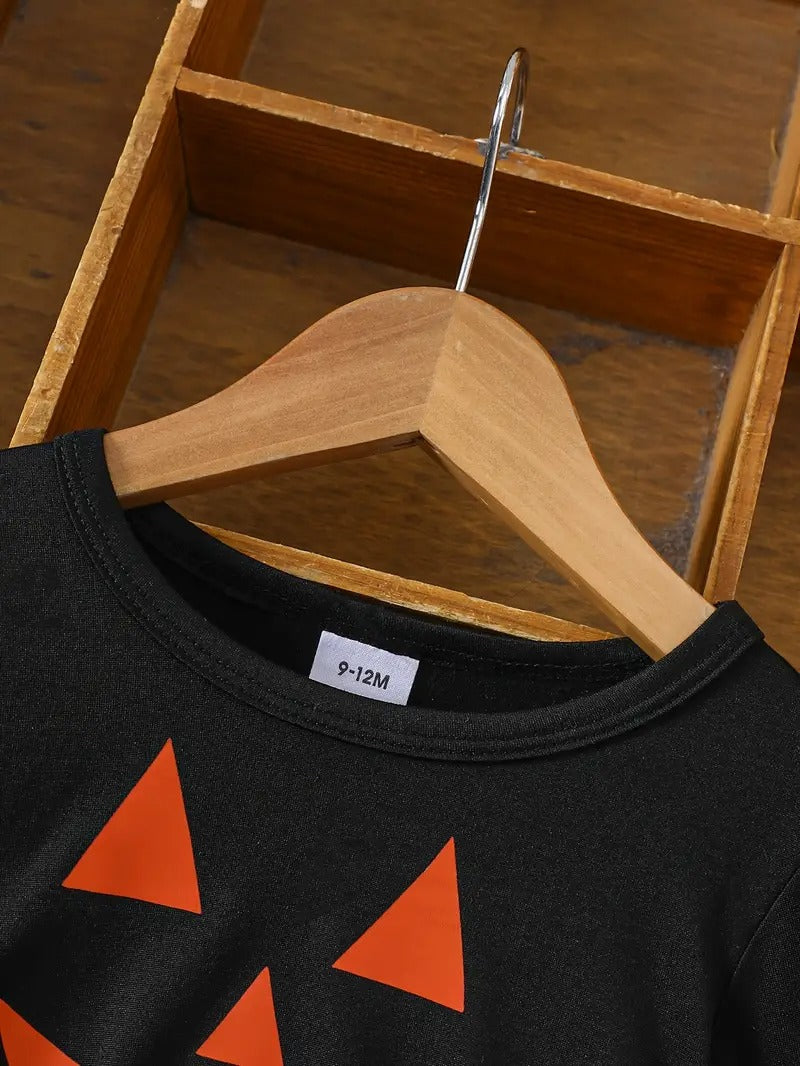 Top Temático de Calabaza: La parte superior negra de manga larga presenta la icónica cara de calabaza (Jack-o'-lantern) en un brillante naranja. Este diseño es simple, reconocible y muy festivo.