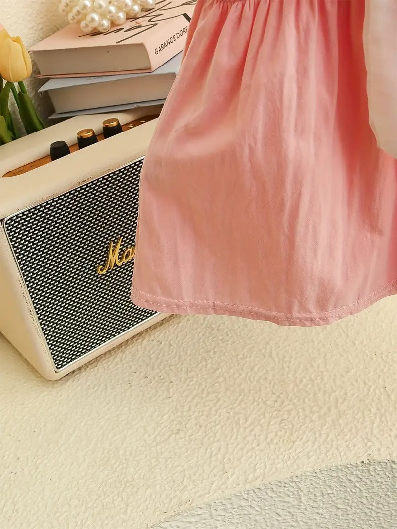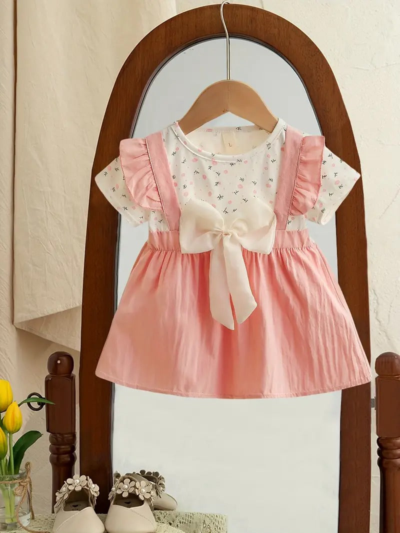 Este adorable vestido es perfecto para resaltar la ternura de tu pequeña. Cuenta con una blusa blanca con delicado estampado floral y volantes en los hombros, que aportan un toque romántico y elegante. La falda rosa con tirantes decorativos y un gran lazo al frente crean un look encantador, ideal para ocasiones especiales, sesiones de fotos o salidas familiares.