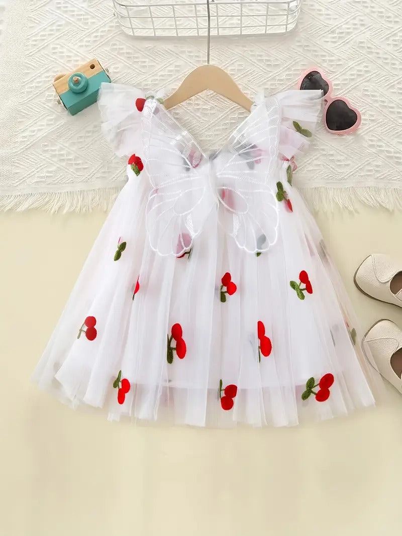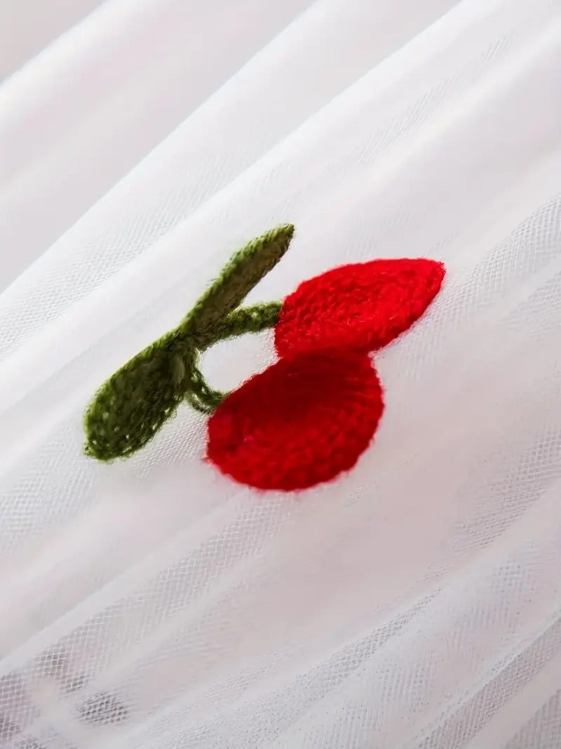 Vestido blanco con tul suave y estampado de cerezas en 3D
