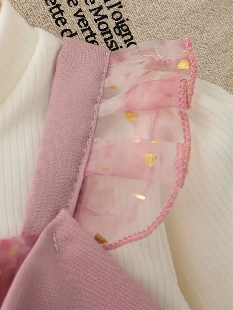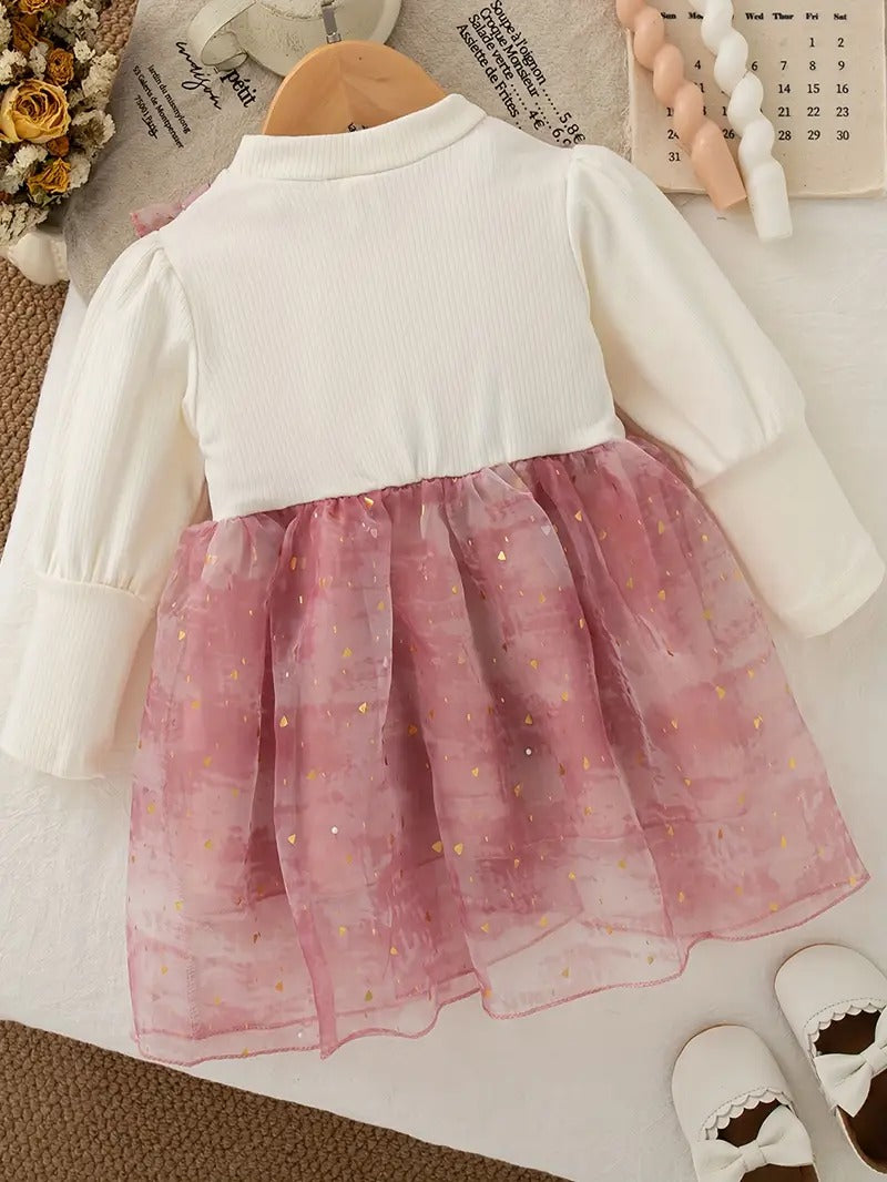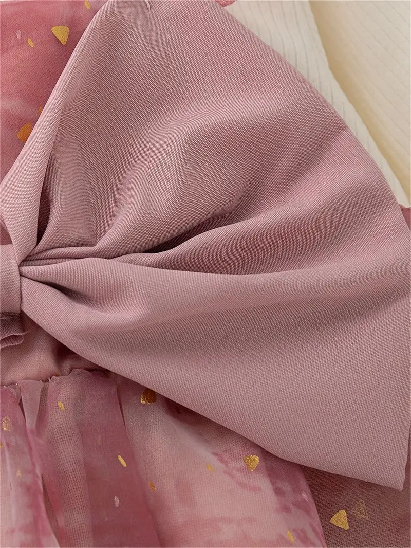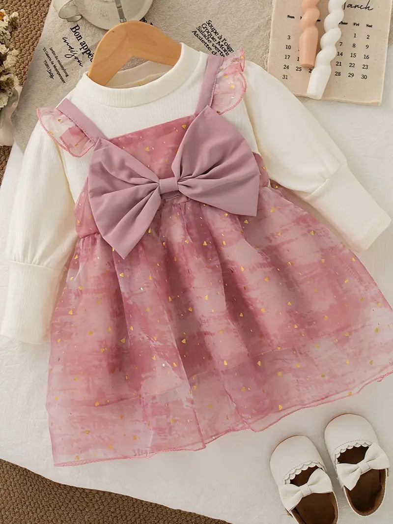 Haz que tu pequeña brille como una princesa con este encantador vestido rosa con lazo mariposa. Confeccionado en una piezas y detalles dorados sobre una falda en gasa tailandesa, con forro interno de algodón, este diseño es perfecto para sesiones de fotos, cumpleaños o celebraciones en primavera y otoño.