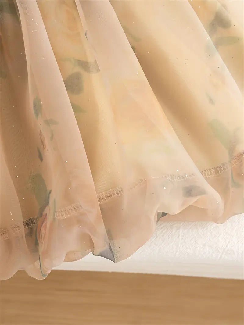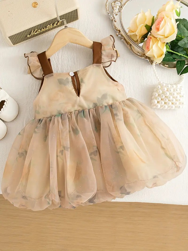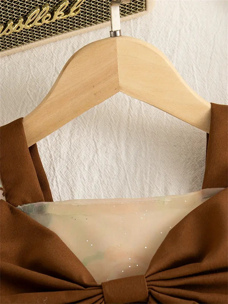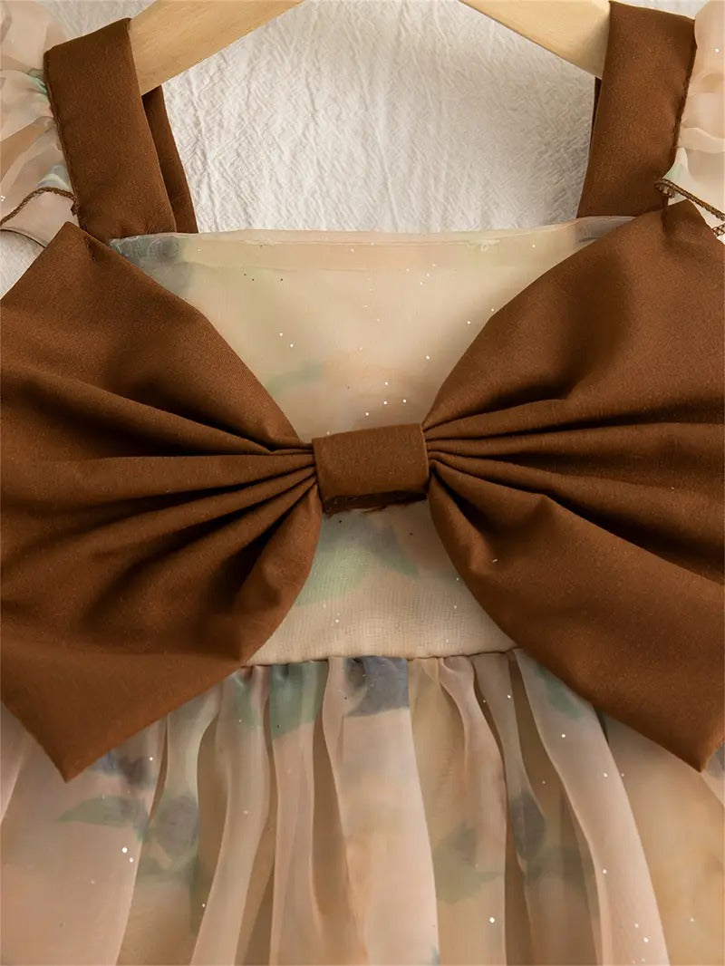 Dale a tu pequeña un look encantador con este vestido beige con toques dorados y un gran lazo marrón chocolate. Perfecto para momentos especiales, este diseño combina dulzura, elegancia y confort en una sola prenda.