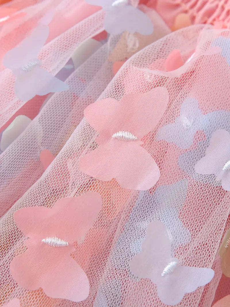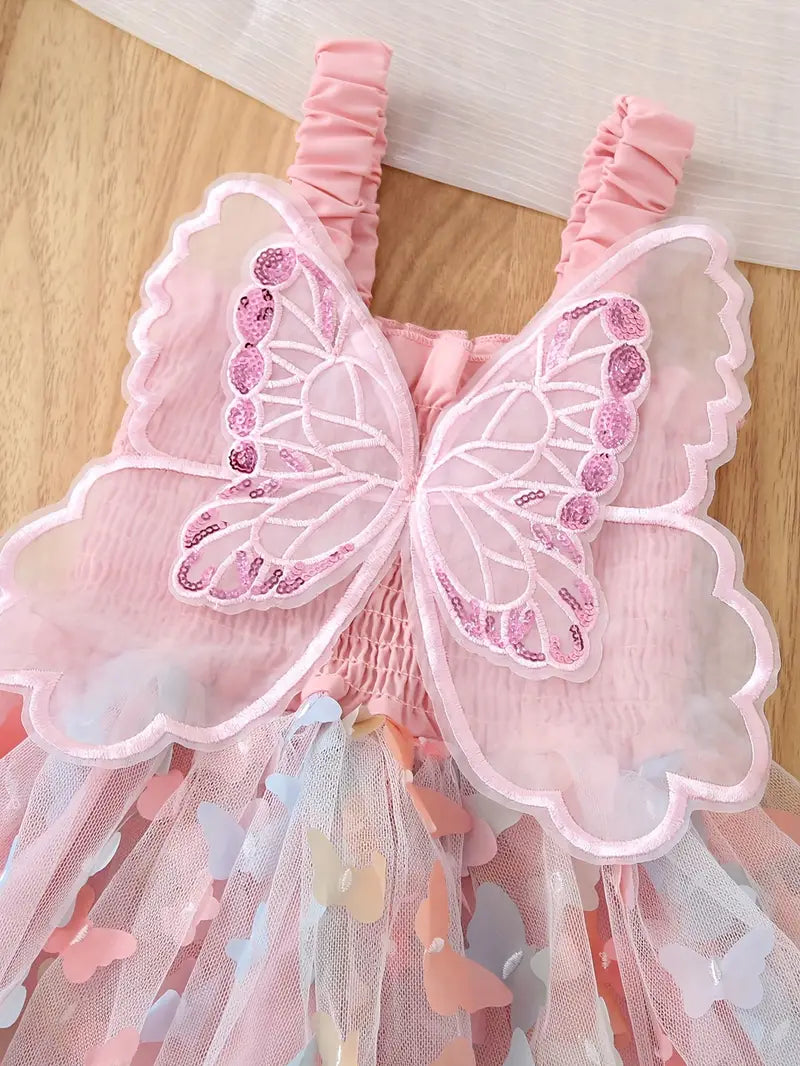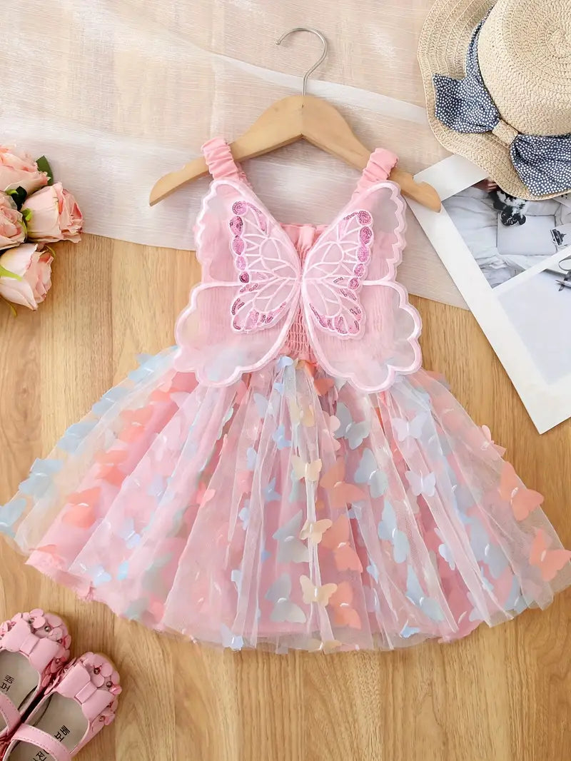 ¡Haz que su primer añito sea mágico e inolvidable! Este encantador vestido en tono rosado pastel está diseñado con tul suave decorado con delicadas mariposas tridimensionales que flotan al caminar. Su parte trasera incluye unas hermosas alas de mariposa, perfectas para sesiones de fotos, fiestas temáticas o cumpleaños.