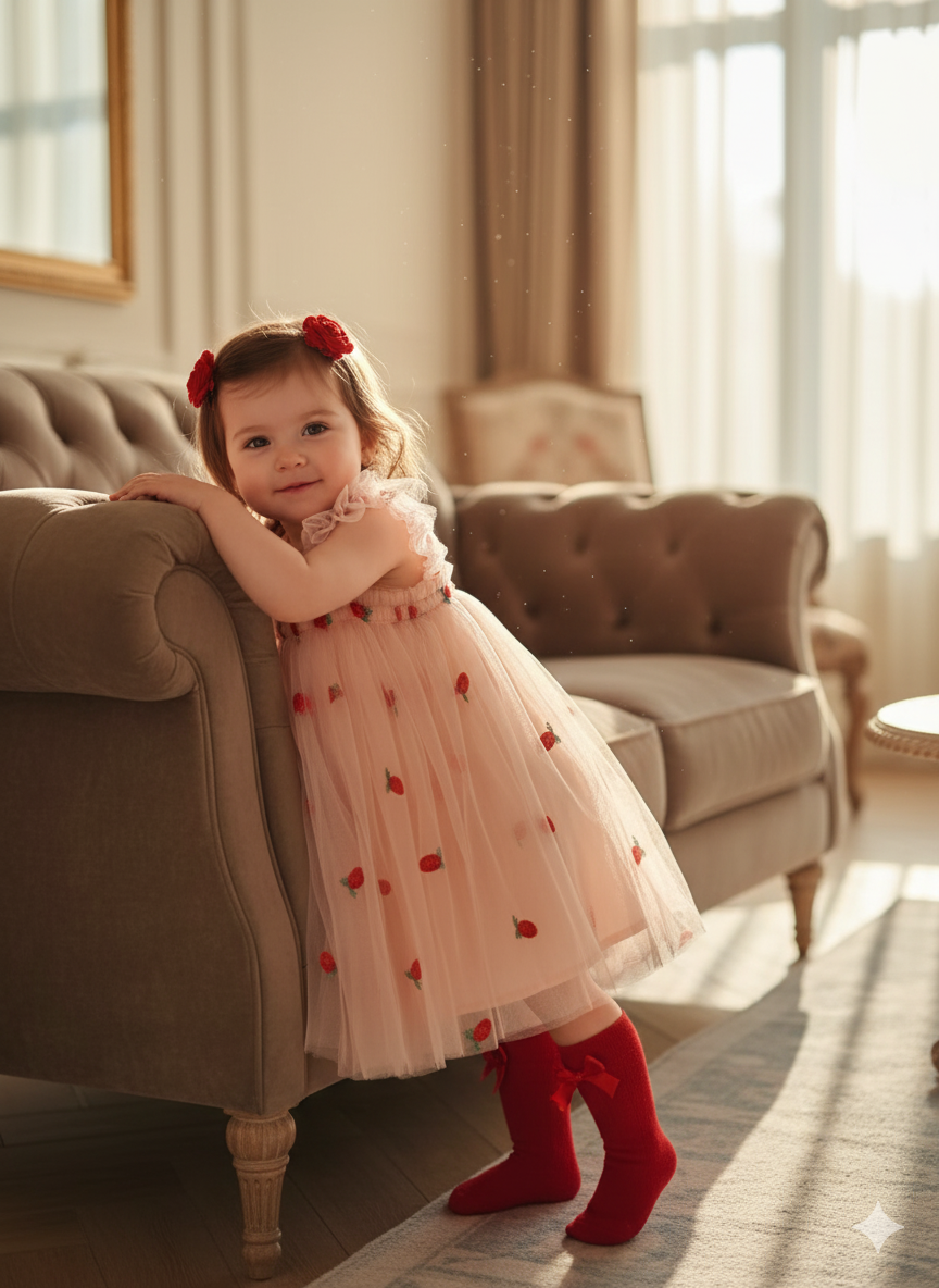 ¡Haz que tu pequeña brille como un hada entre fresas! Este vestido estilo tutú es perfecto para ocasiones especiales, cumpleaños, sesiones de fotos o simplemente para esos días en que quieres verla mágica y feliz.