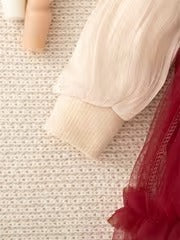 La "Blusa" Superior: La parte superior simula un suéter ligero o blusa de color crema suave. Cuenta con mangas largas abullonadas para abrigar y destaca por sus volantes en los hombros, que añaden un toque romántico y movimiento.