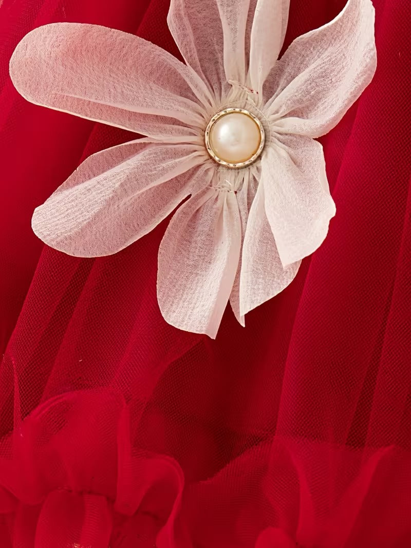 Falda de Tul con Volumen: La falda está compuesta por múltiples capas de tul rojo de alta calidad. Lo que la hace especial es su dobladillo con acabado rizado (ruffled hem), una técnica de costura que multiplica el volumen en el bajo y crea un efecto de "nube" y movimiento precioso al caminar o girar.