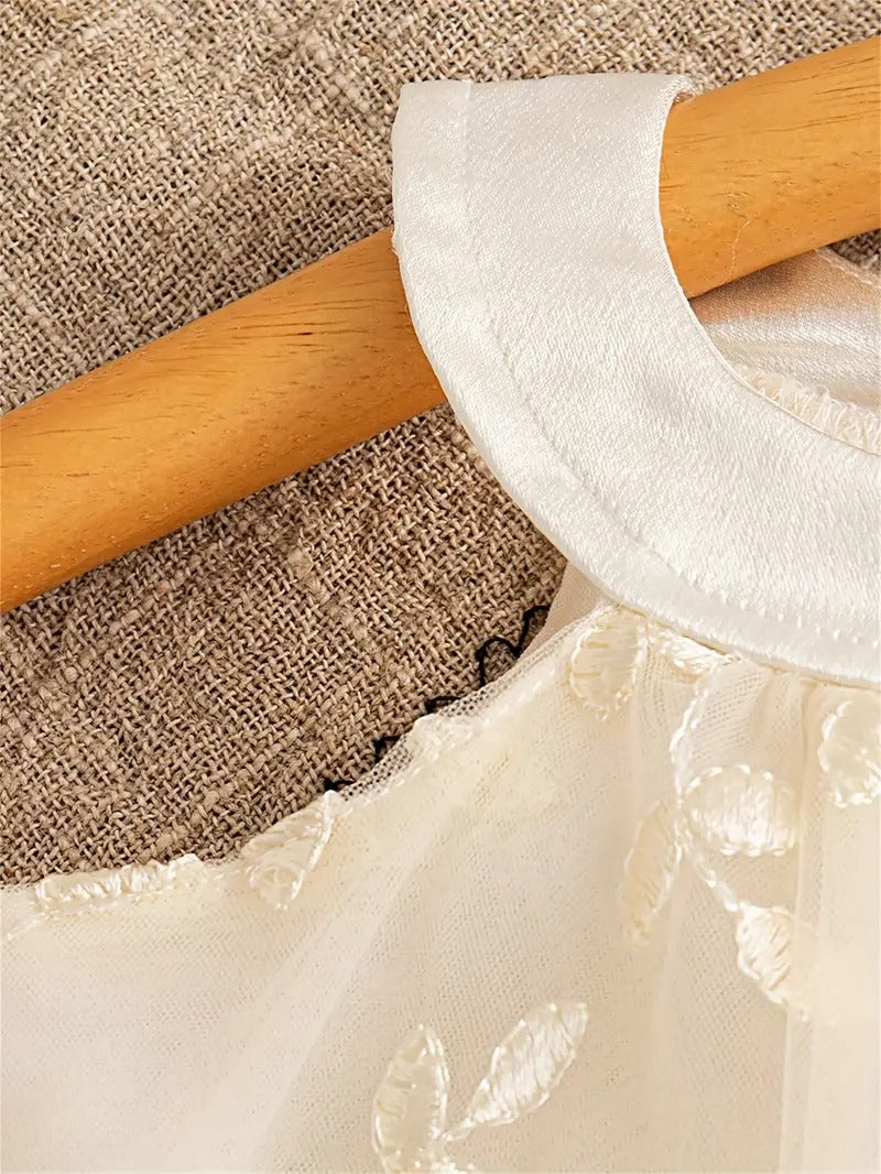 Tejido Etéreo: Confeccionado en tul suave y liviano que crea una silueta encantadora y cómoda. La tela principal presenta un delicado bordado floral tono sobre tono con sutiles aplicaciones 3D de flores, que le dan una textura rica y sofisticada.