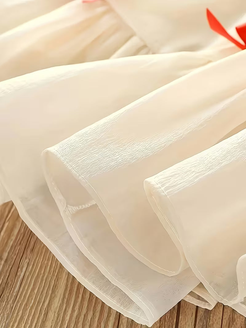 Este vestido es muy alegre y coqueto. El contraste del color claro con los lazos rojos hace que resalte mucho, perfecto para una fiesta, una salida de verano o incluso para Navidad.