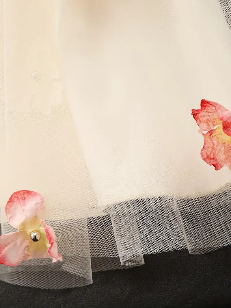 Tejido Delicado: Confeccionado con un ligero tul color crema o marfil que crea una silueta suave y voluminosa. Es cómodo y permite que la piel respire, perfecto para el clima cálido.