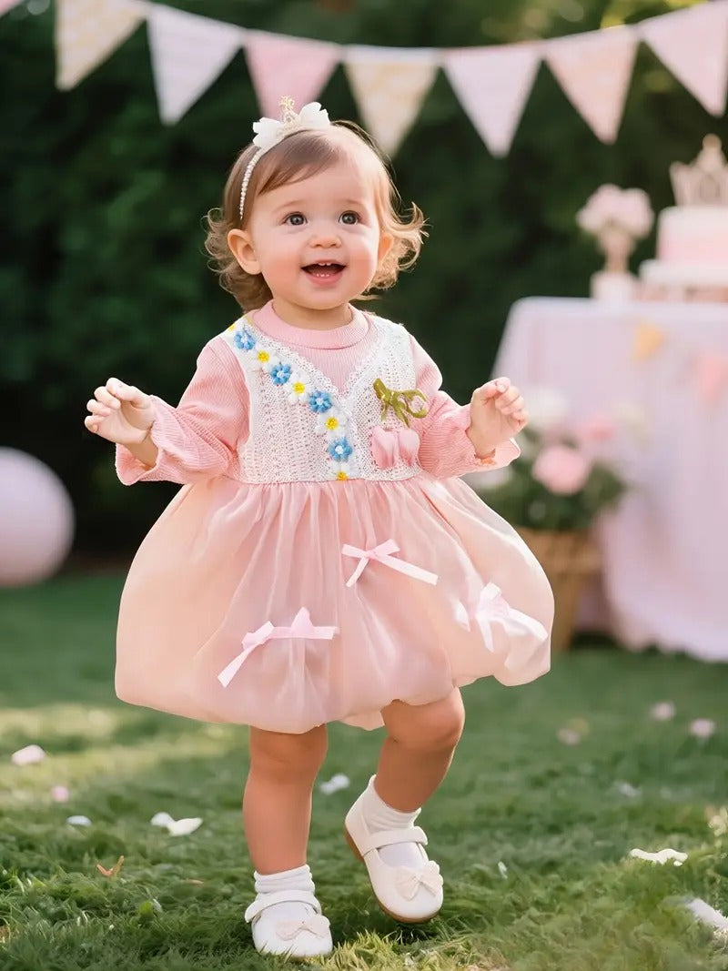 Haz que tu pequeña luzca como una princesa con este encantador vestido de una pieza. Su diseño combina la suavidad del algodón con un delicado encaje floral y detalles de tulipanes en relieve, creando un look romántico y sofisticado perfecto para toda ocasión especial.
